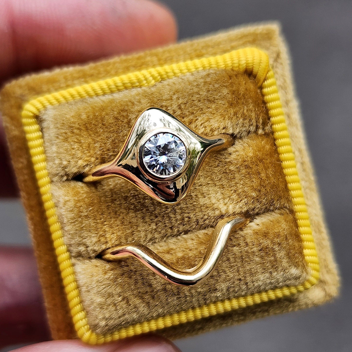 This simple and sleek solitaire is inspired by antique rings. The center stone shown is a 5mm moissanite that weighs .41 carats. Comes with a matching curved wedding band.