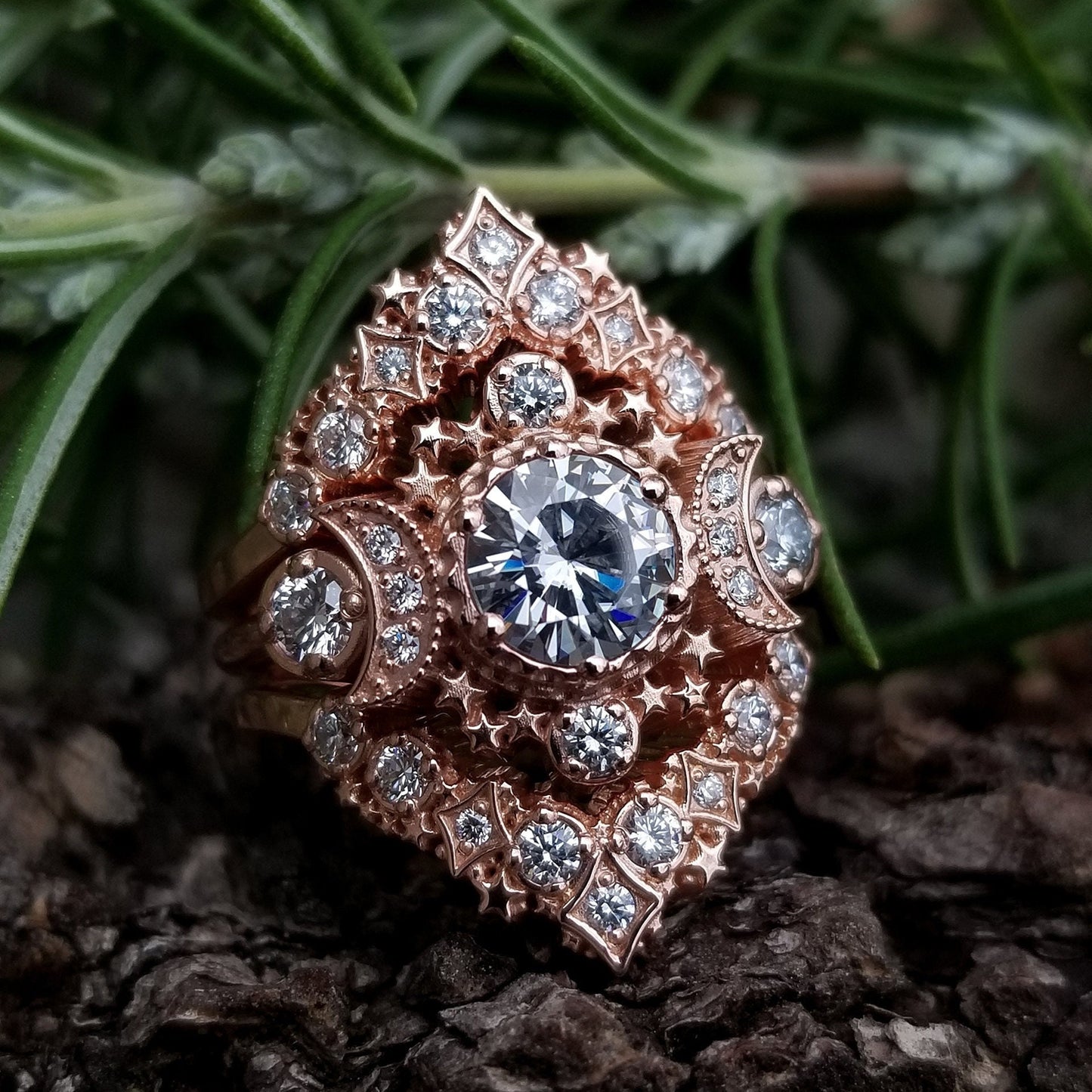 Cosmos Engagement Ring Set - Moissanite or Diamonds Custom Wedding Set - 14k Gold Witchy Engagement