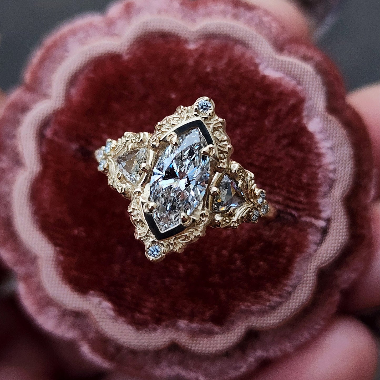 The Delilah engagement and wedding ring set is highly detailed and with delicate gold details, a marquise center stone and trillion side gems with natural diamond accents.