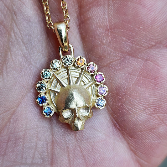 Rainbow Aura Angel Pendant - Catacomb Memento Mori Gold Skull Necklace with Natural Sapphires - Gothic Fine Jewelry