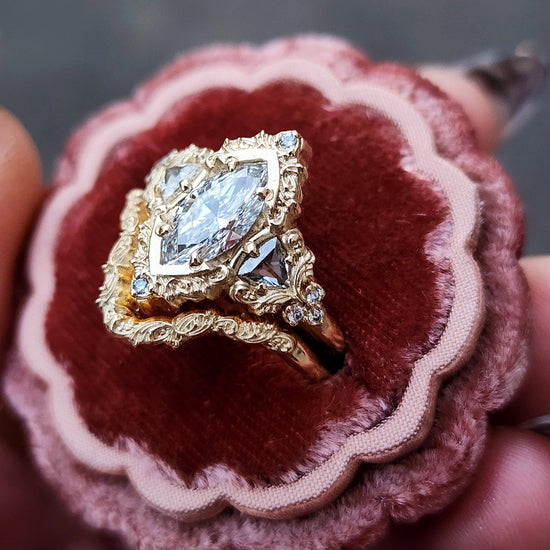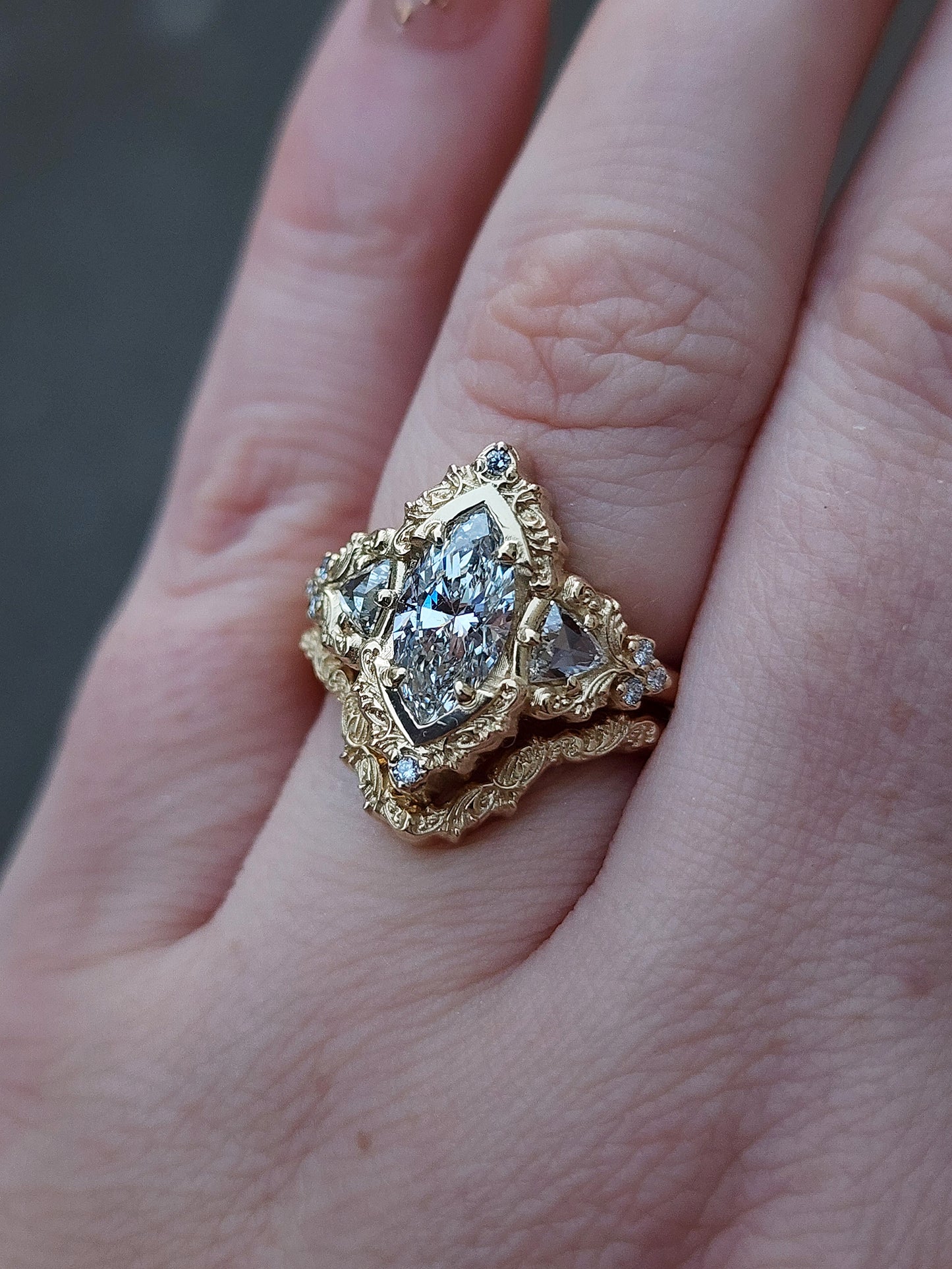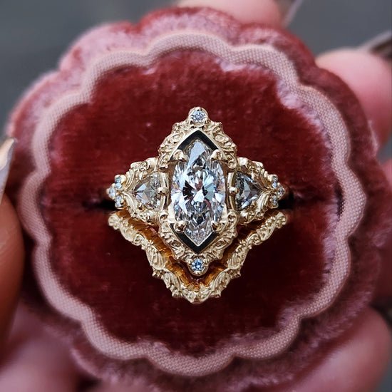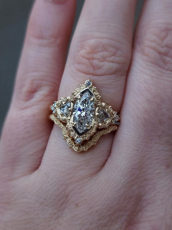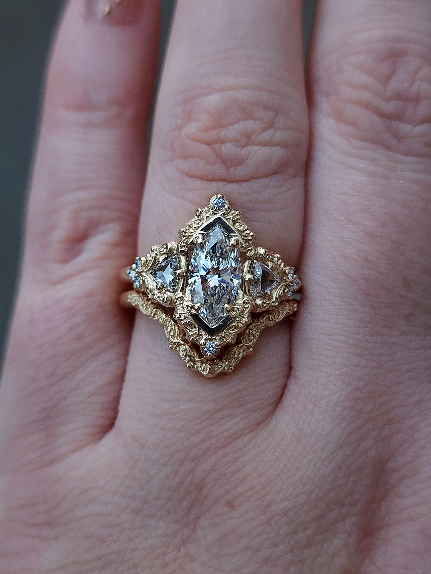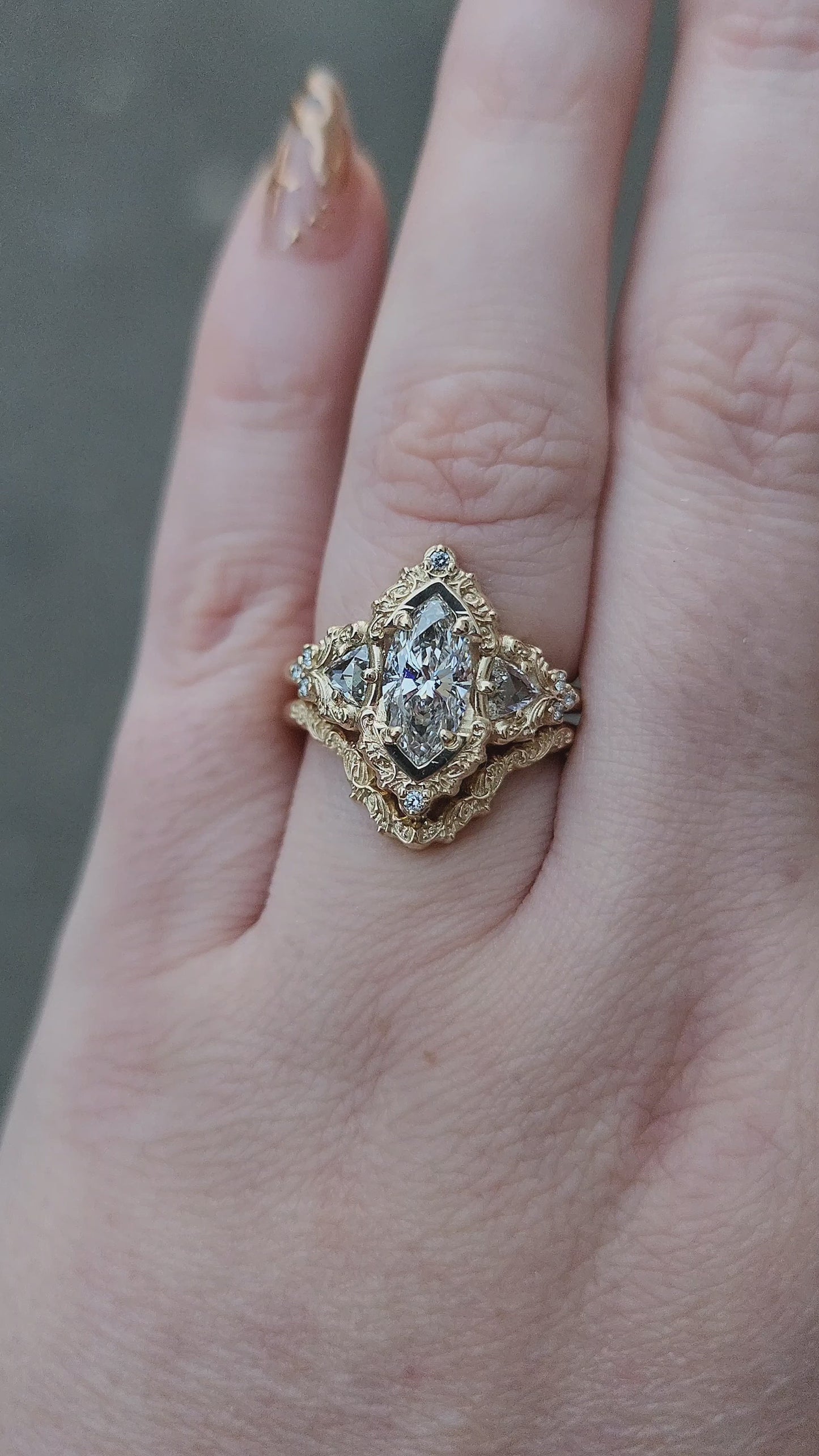 The Delilah engagement and wedding ring set is highly detailed and with delicate gold details, a marquise center stone and trillion side gems with natural diamond accents.