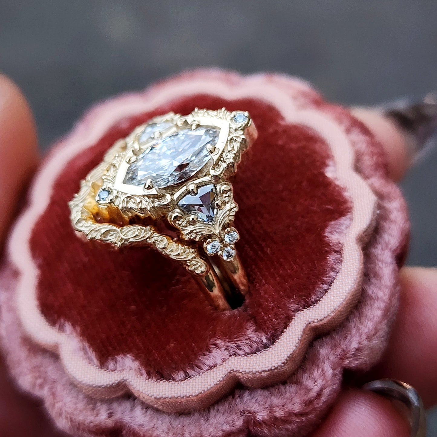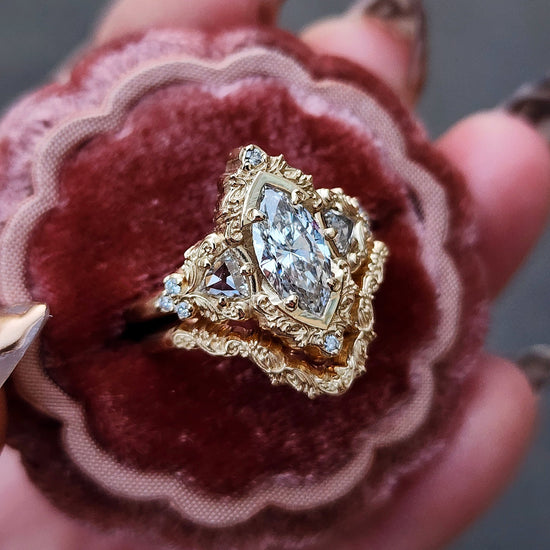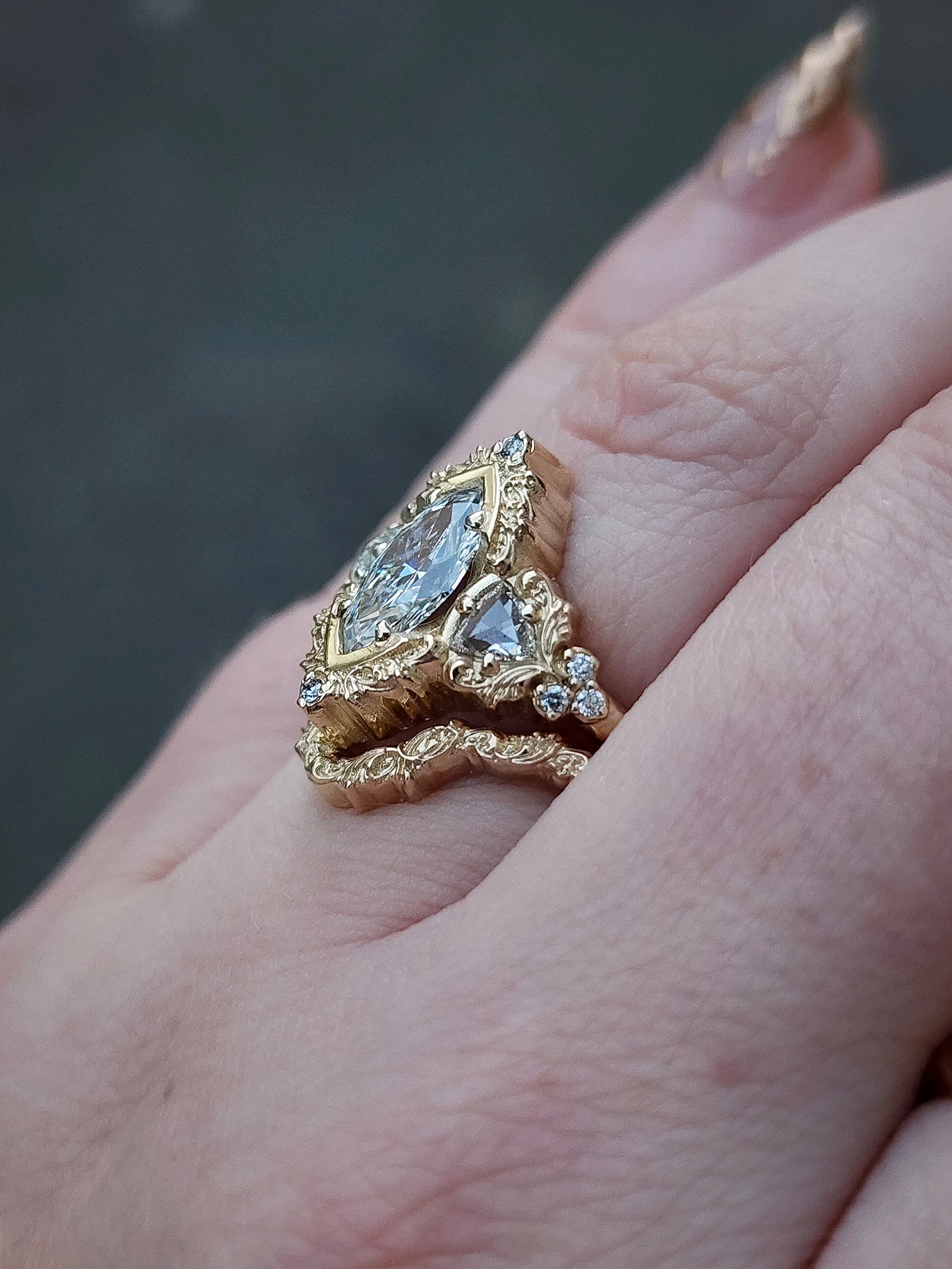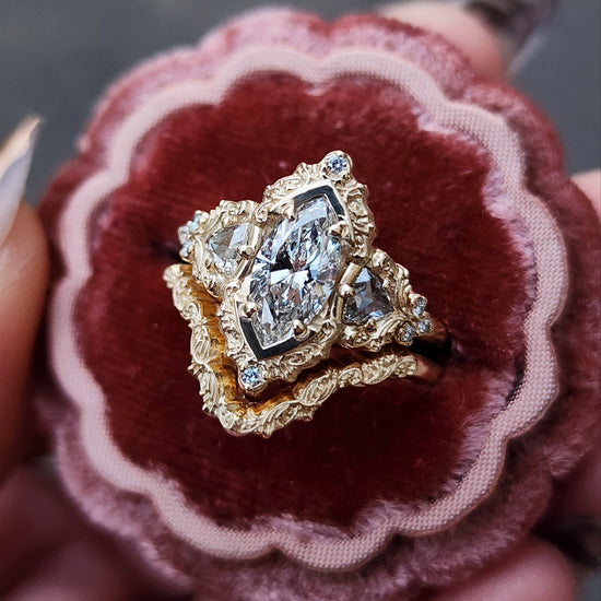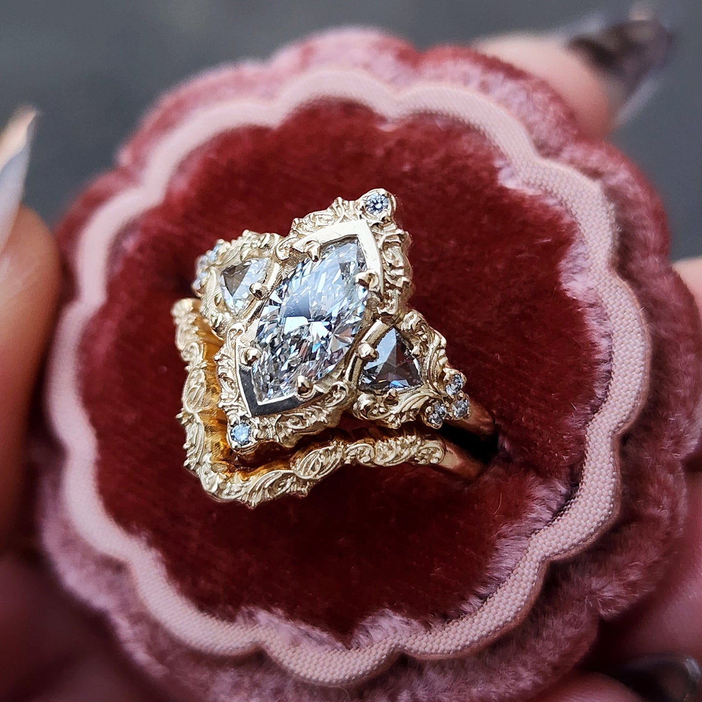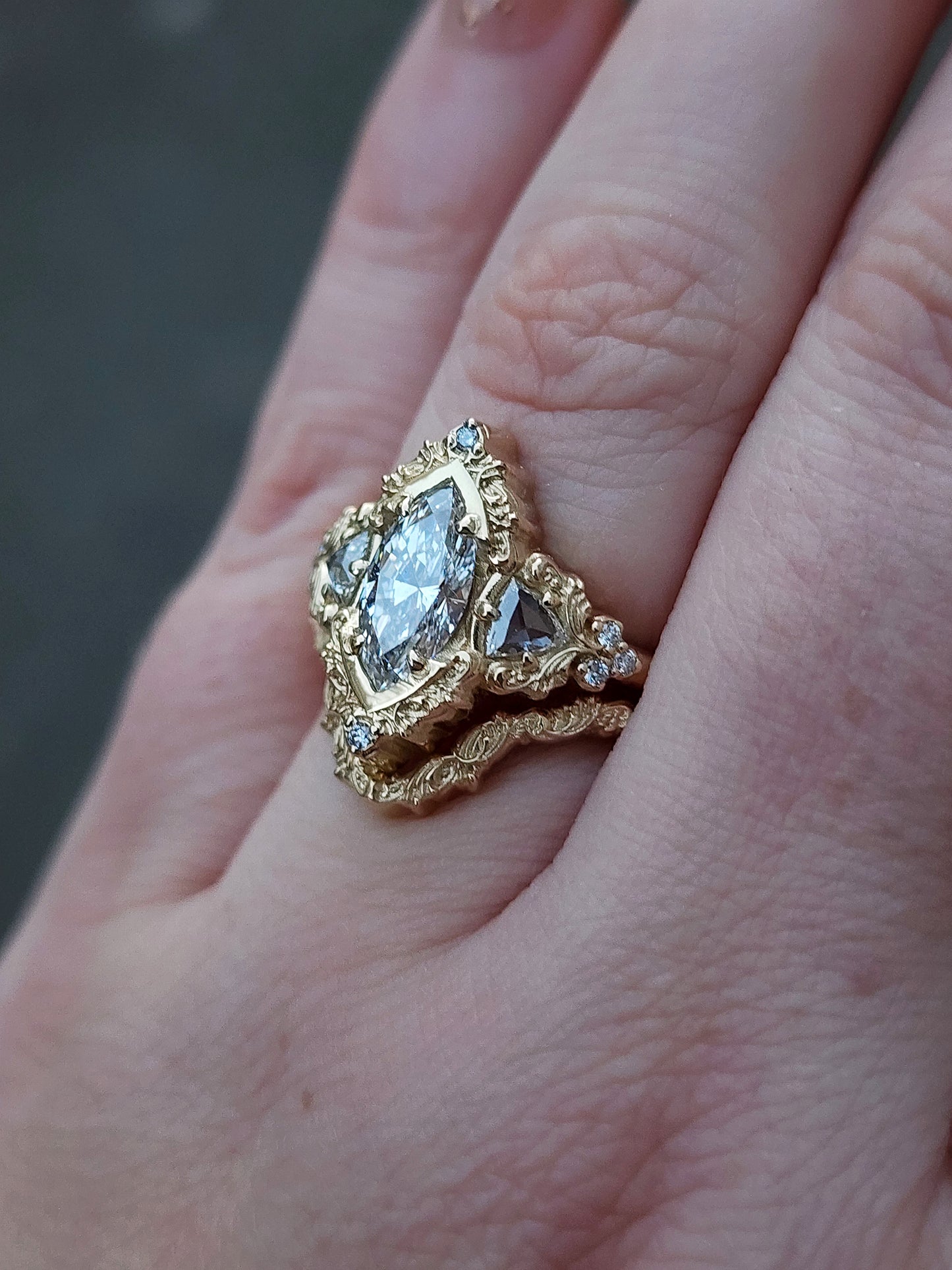 The Delilah engagement and wedding ring set is highly detailed and with delicate gold details, a marquise center stone and trillion side gems with natural diamond accents.