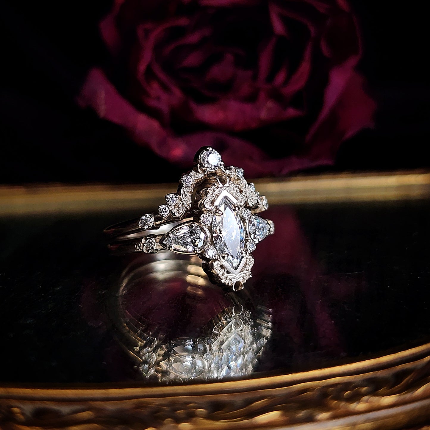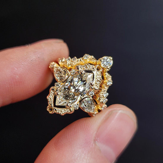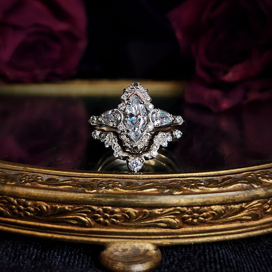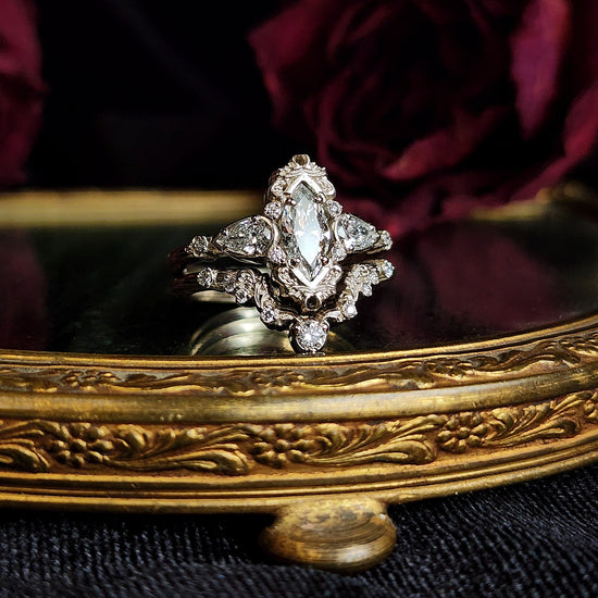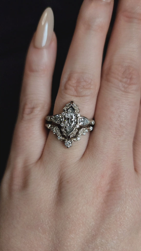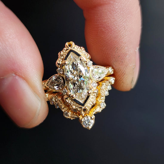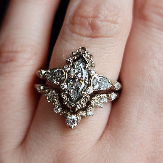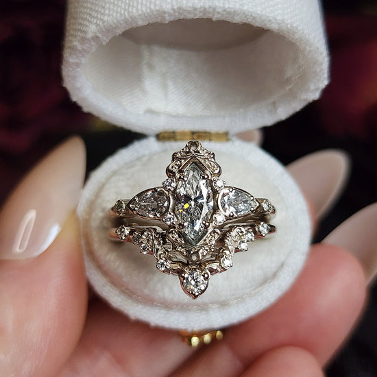 The Odette Marquise Engagement Ring is a stunning blend of antique-inspired design and modern craftsmanship. Featuring intricate filigree detailing and pear-shaped side stones, this ring exudes femininity and elegance. Handmade with 14k gold, it offers a touch of luxury for your special occasion. Small accent diamonds are VS natural diamonds. Can be set with black diamonds upon request.