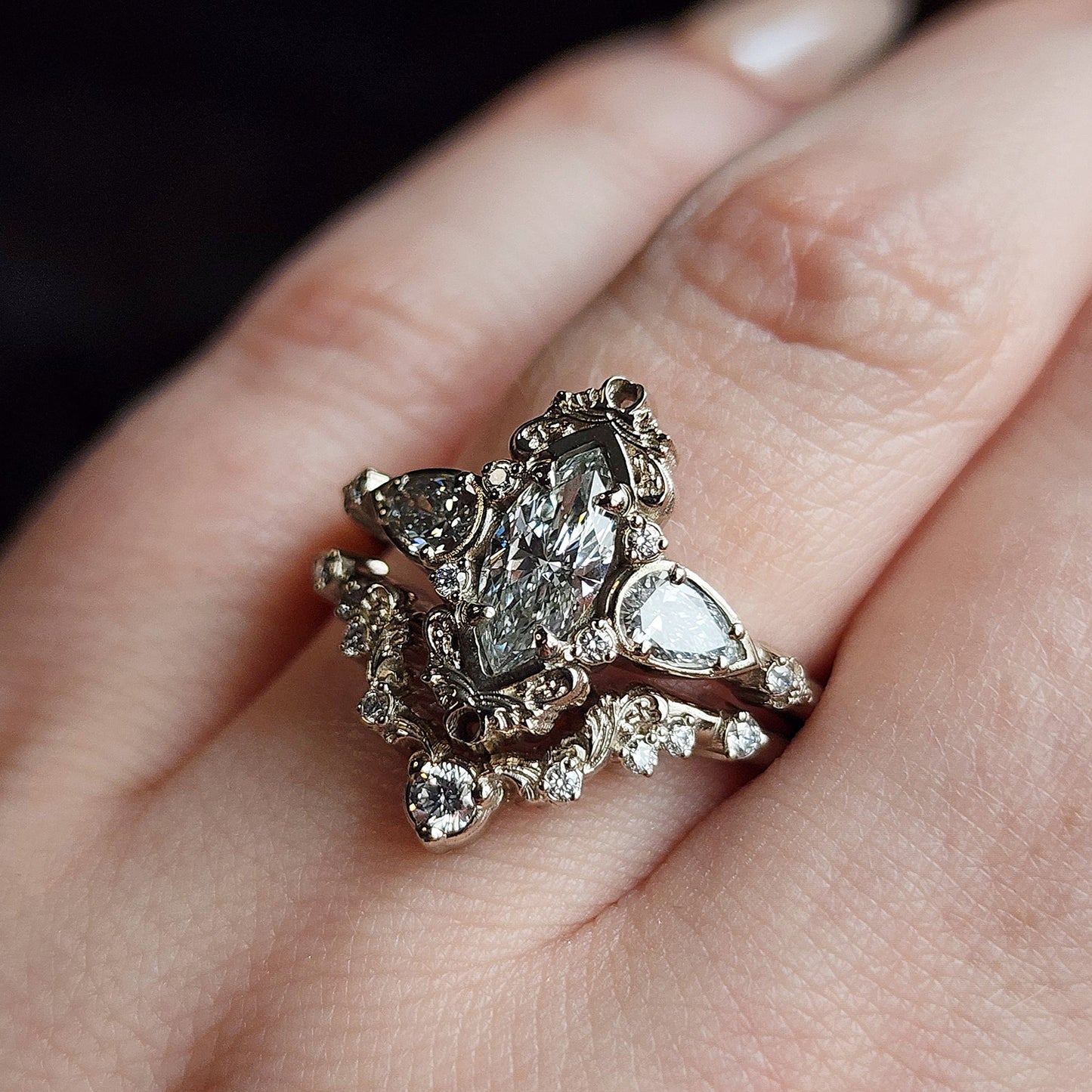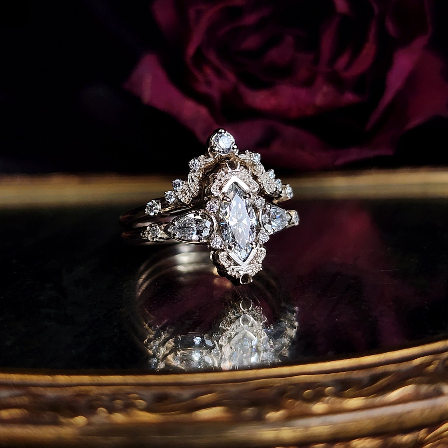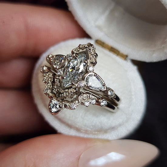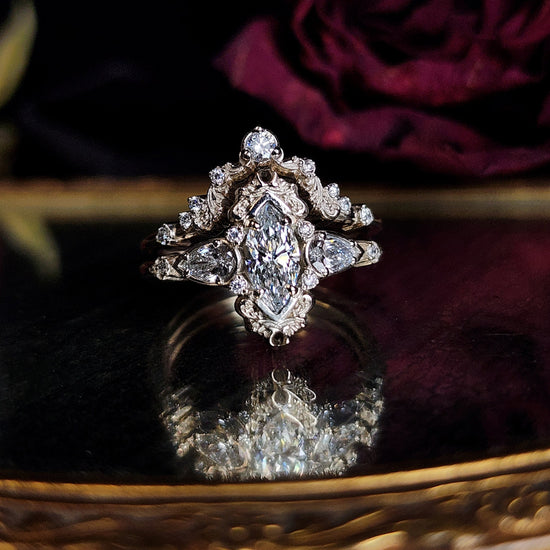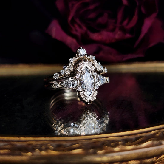 The Odette Marquise Engagement Ring is a stunning blend of antique-inspired design and modern craftsmanship. Featuring intricate filigree detailing and pear-shaped side stones, this ring exudes femininity and elegance. Handmade with 14k gold, it offers a touch of luxury for your special occasion. Small accent diamonds are VS natural diamonds. Can be set with black diamonds upon request.