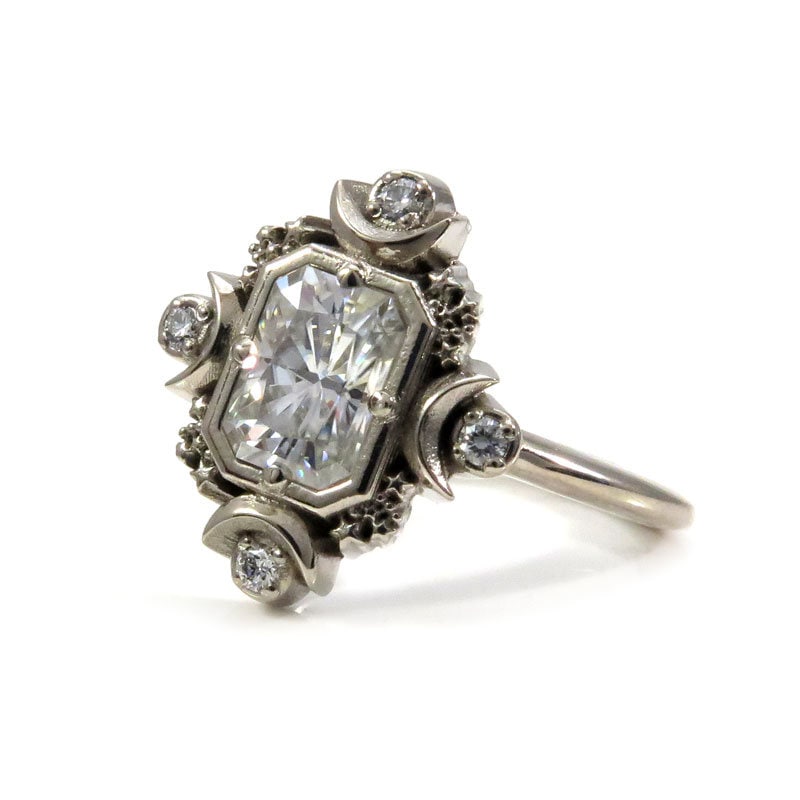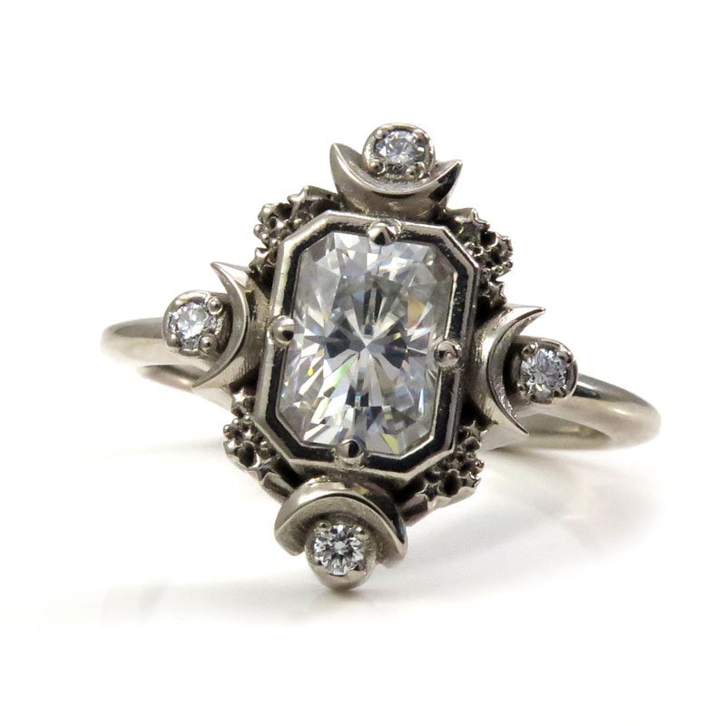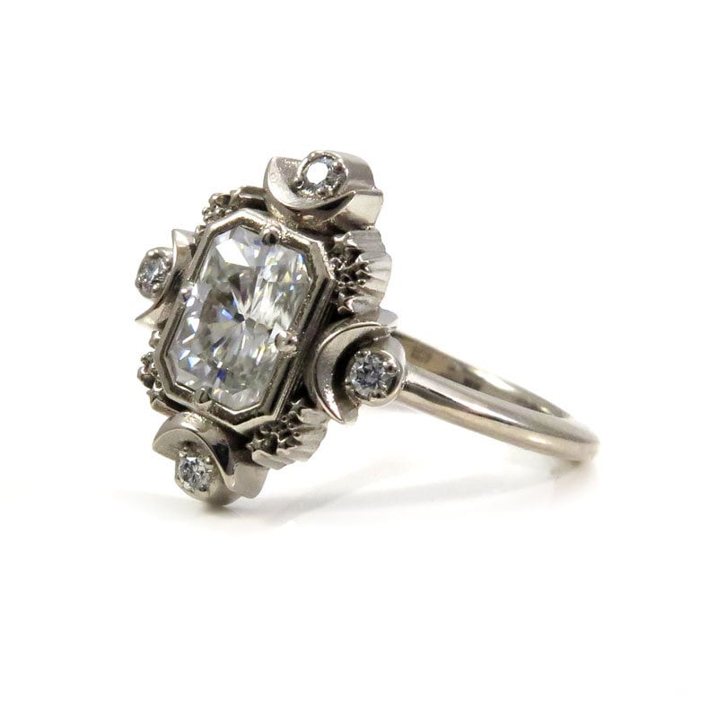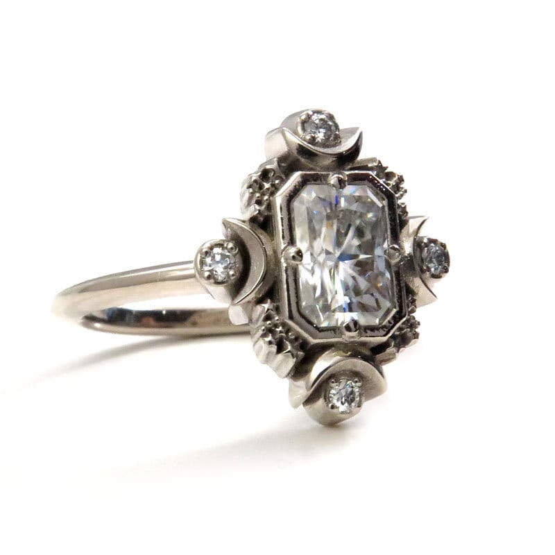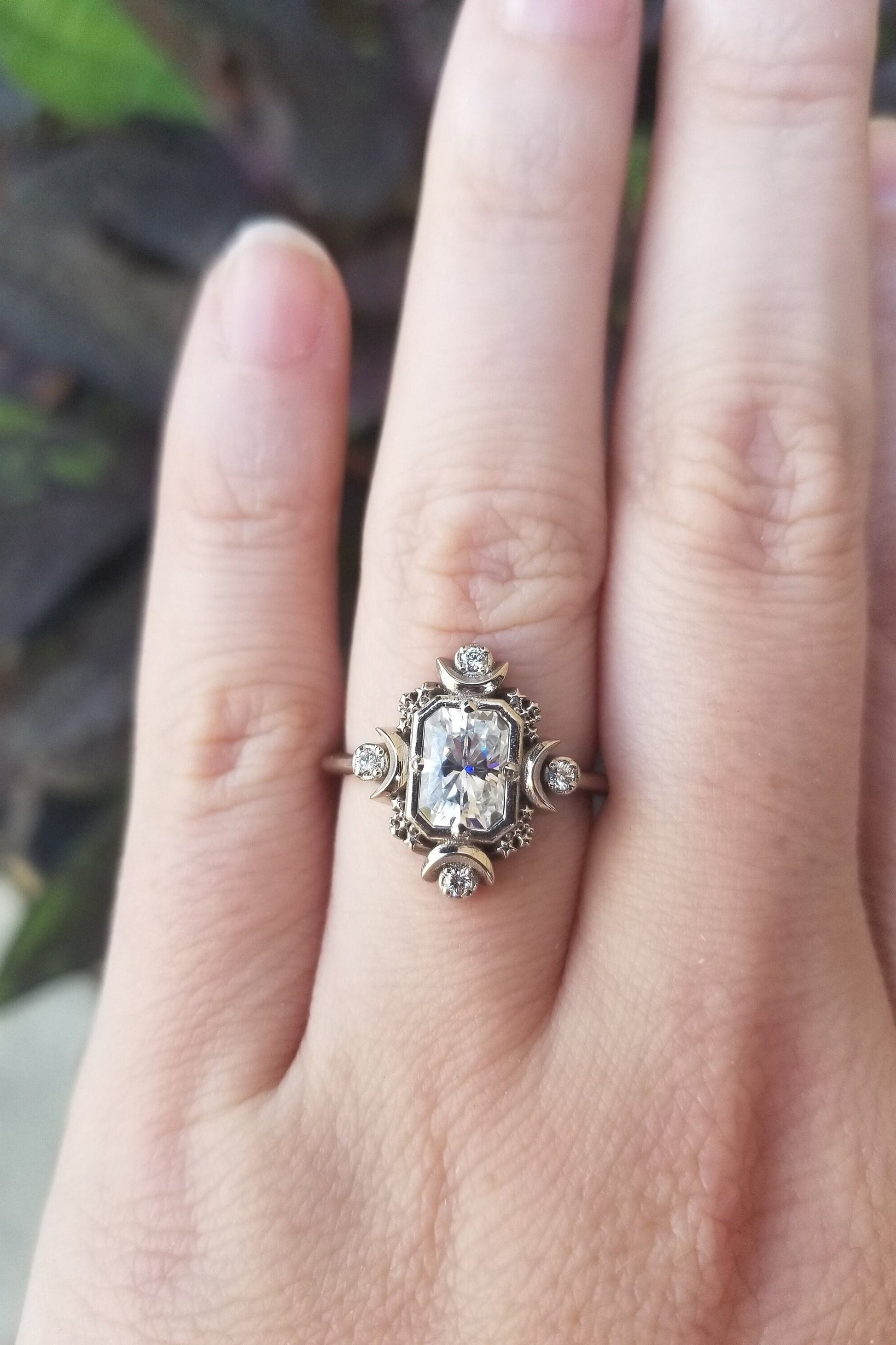 - For reference the center stone shown is a 7x5mm Radiant cut Moissanite.