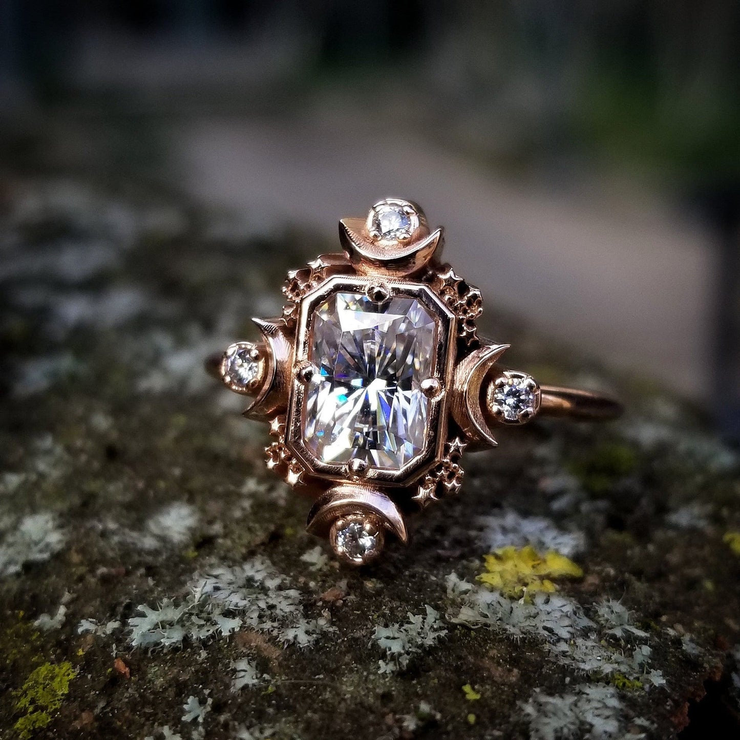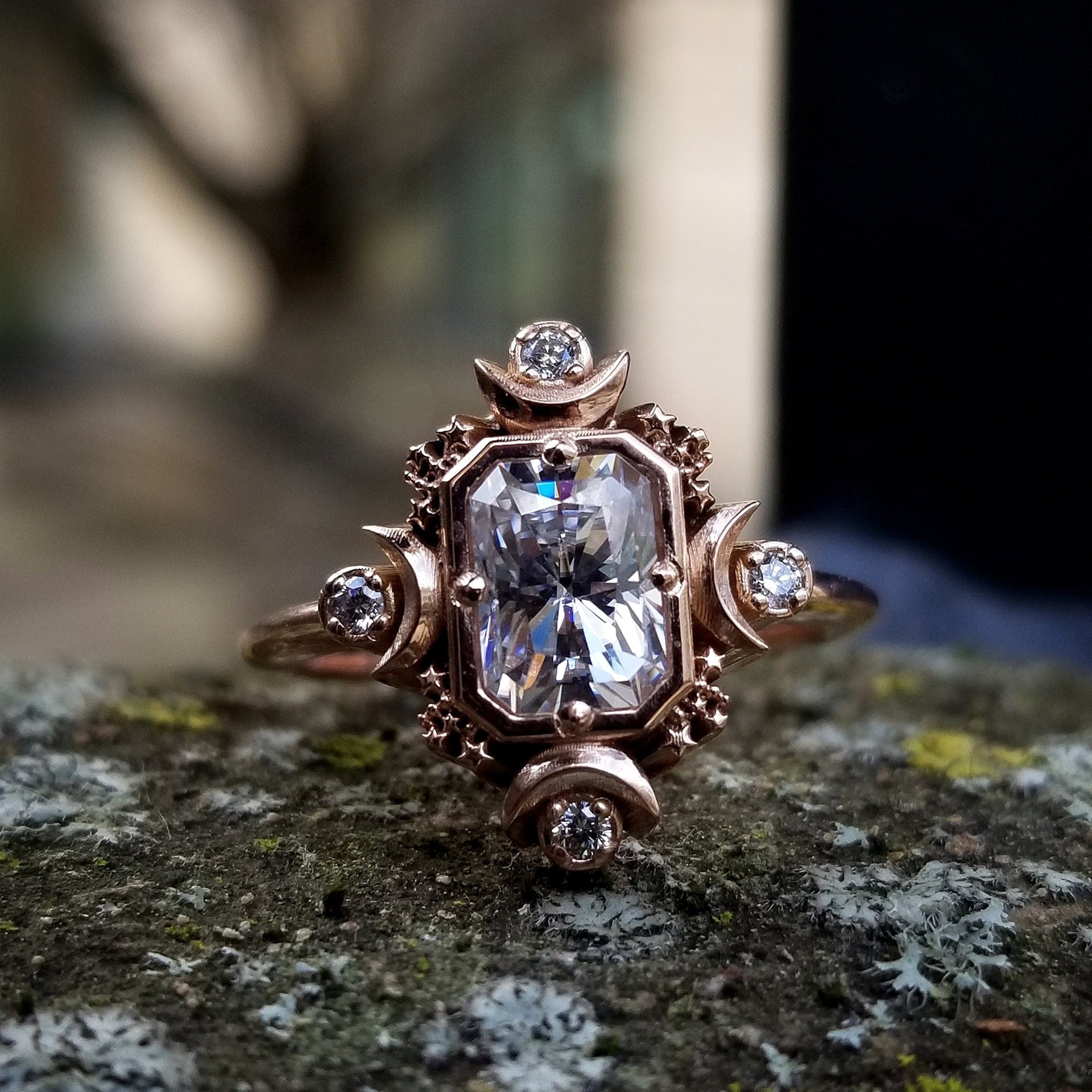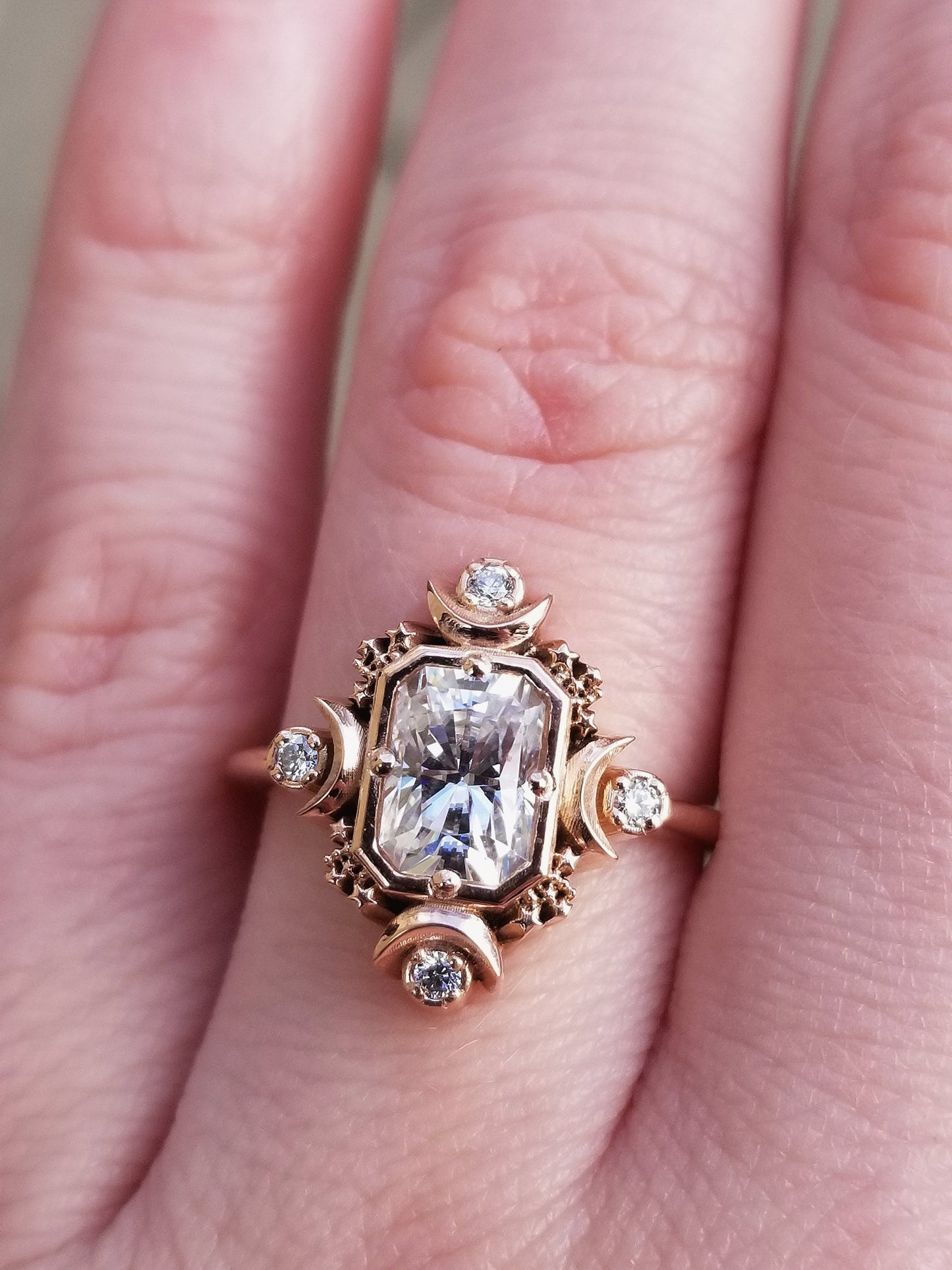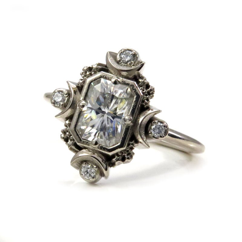 - For reference the center stone shown is a 7x5mm Radiant cut Moissanite.