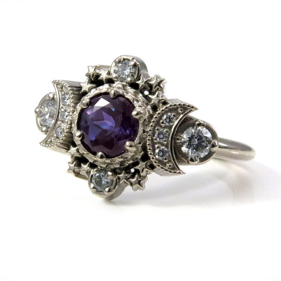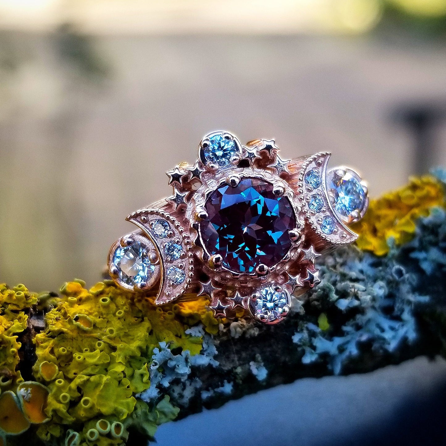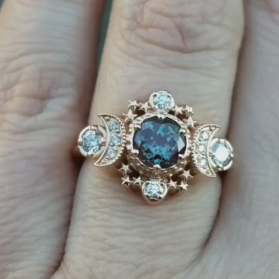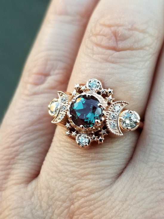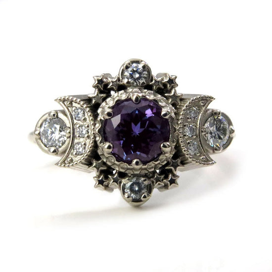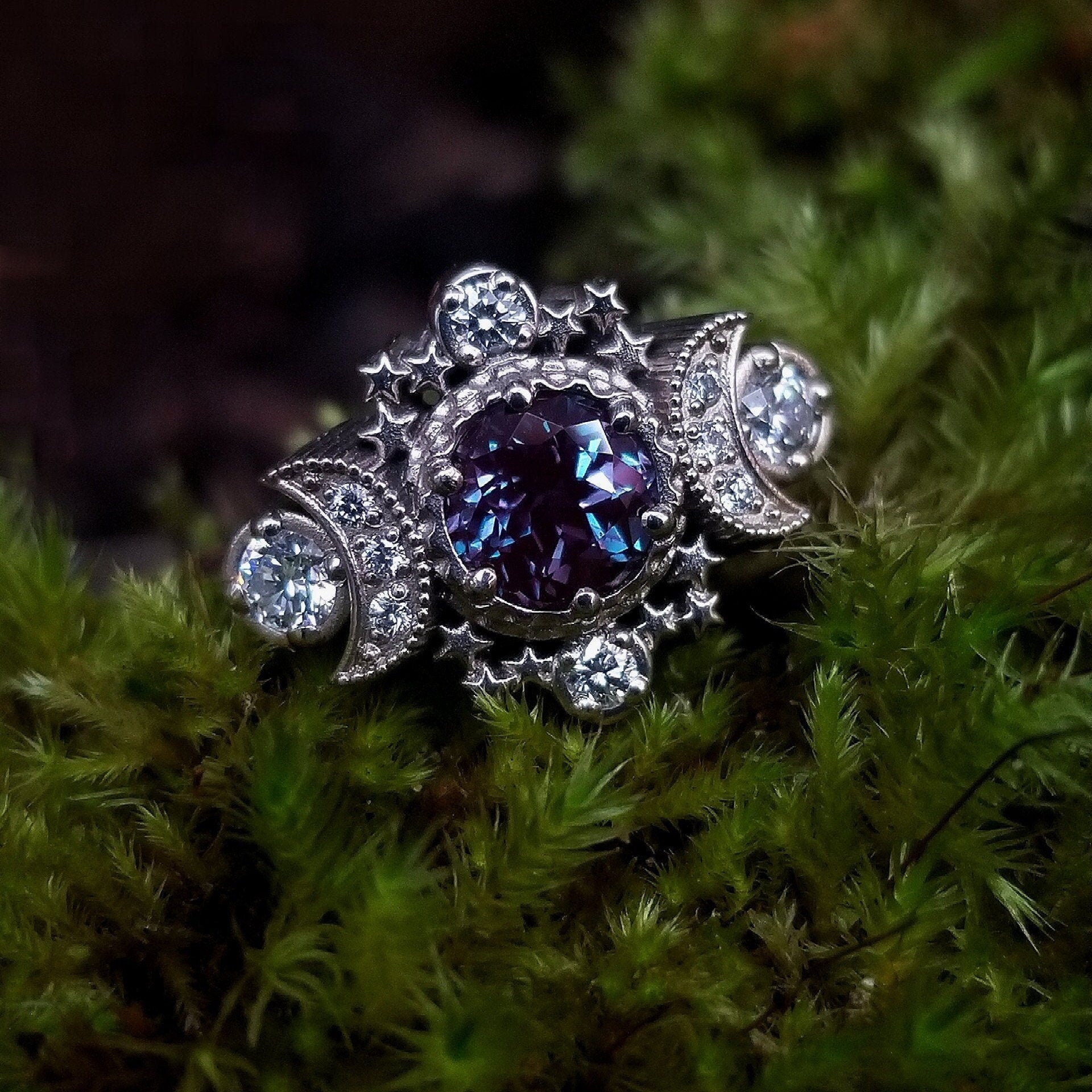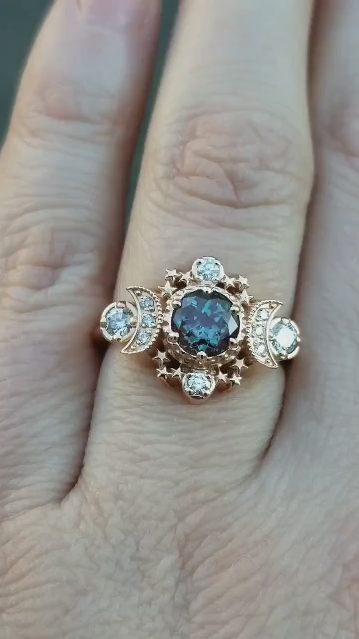 The center stone is representing the full moon and is a gorgeous color change Chatham lab Alexandrite, you can choose to have your ring set with a 6mm (shown in first photo) or 6.5mm Alexandrite. The 6mm gems weigh approximately 1.10 carats and the 6.5mm gems weigh approx. 1.3 carats. The ring is set with 10 white diamonds, they have a combined carat weight of approximately .30 carats, they are VS clarity.