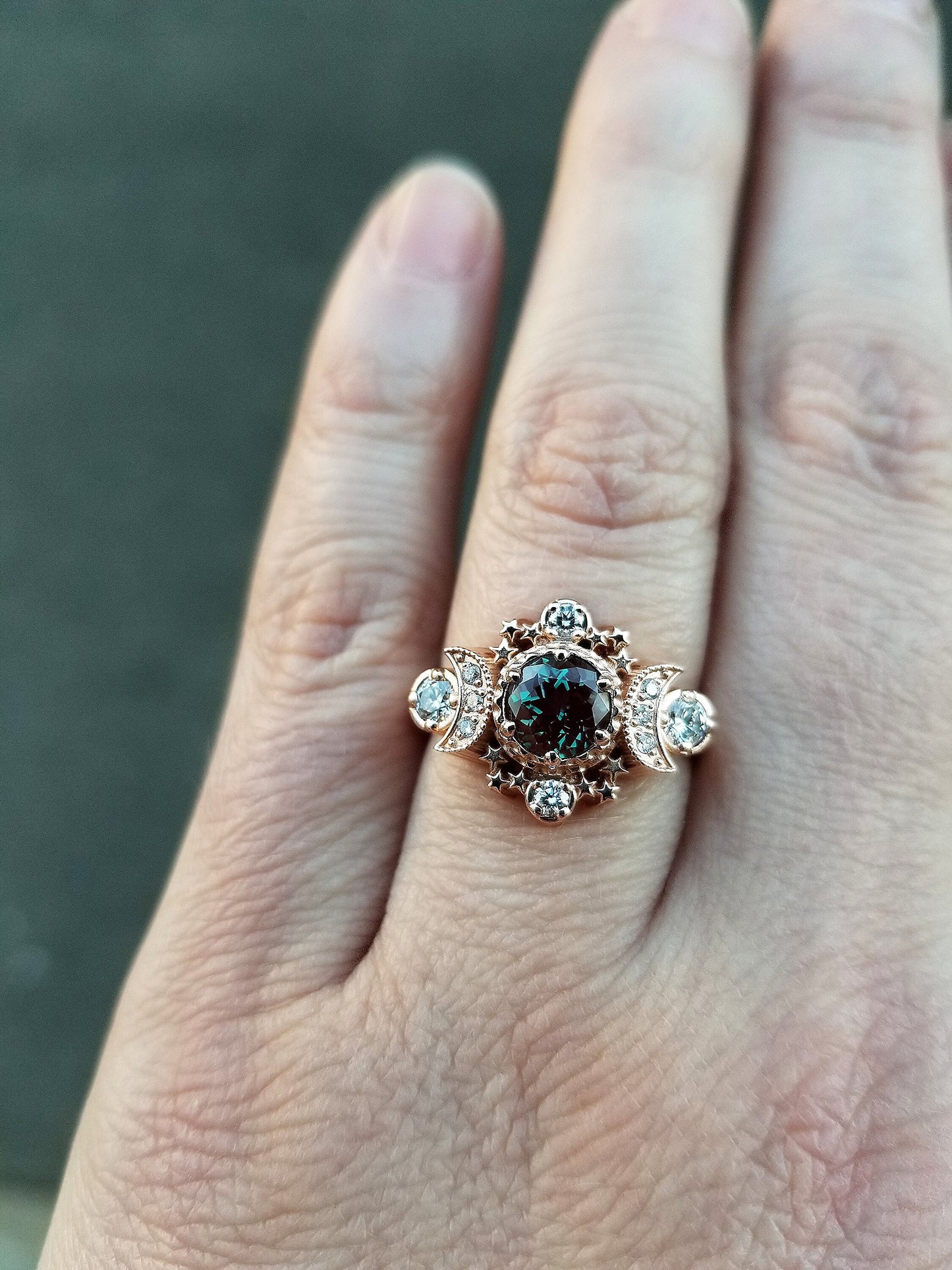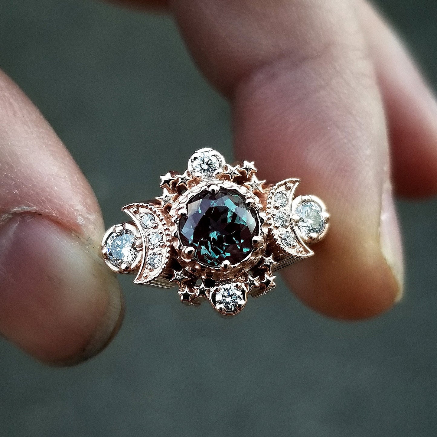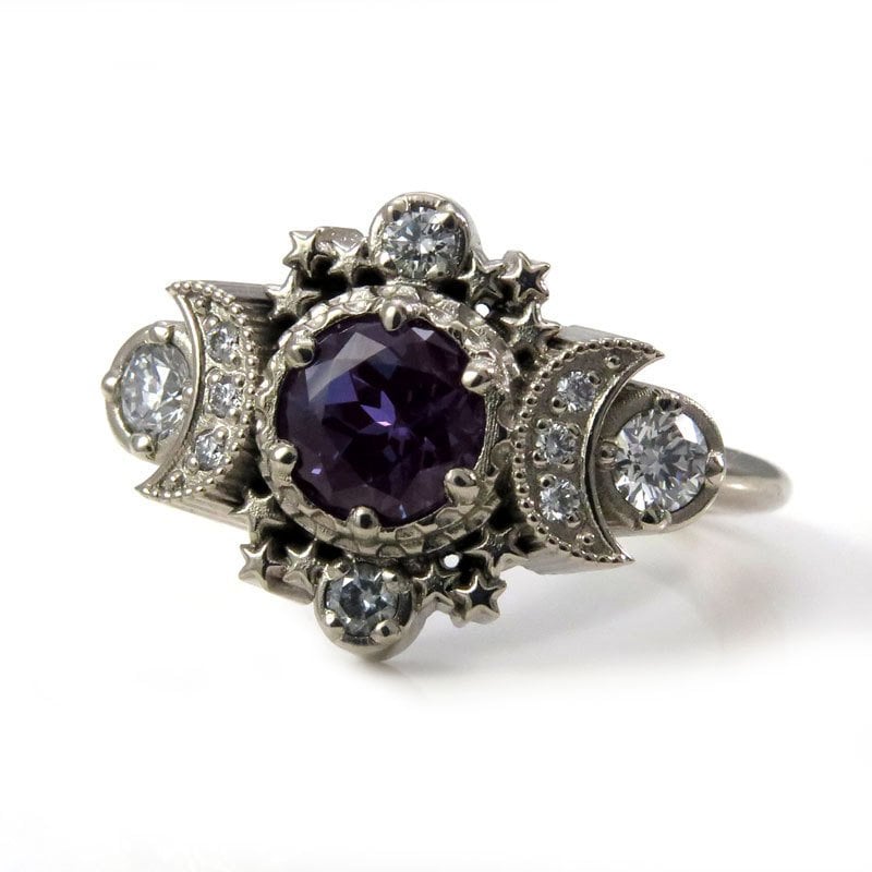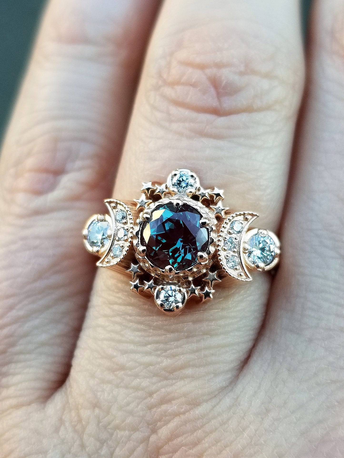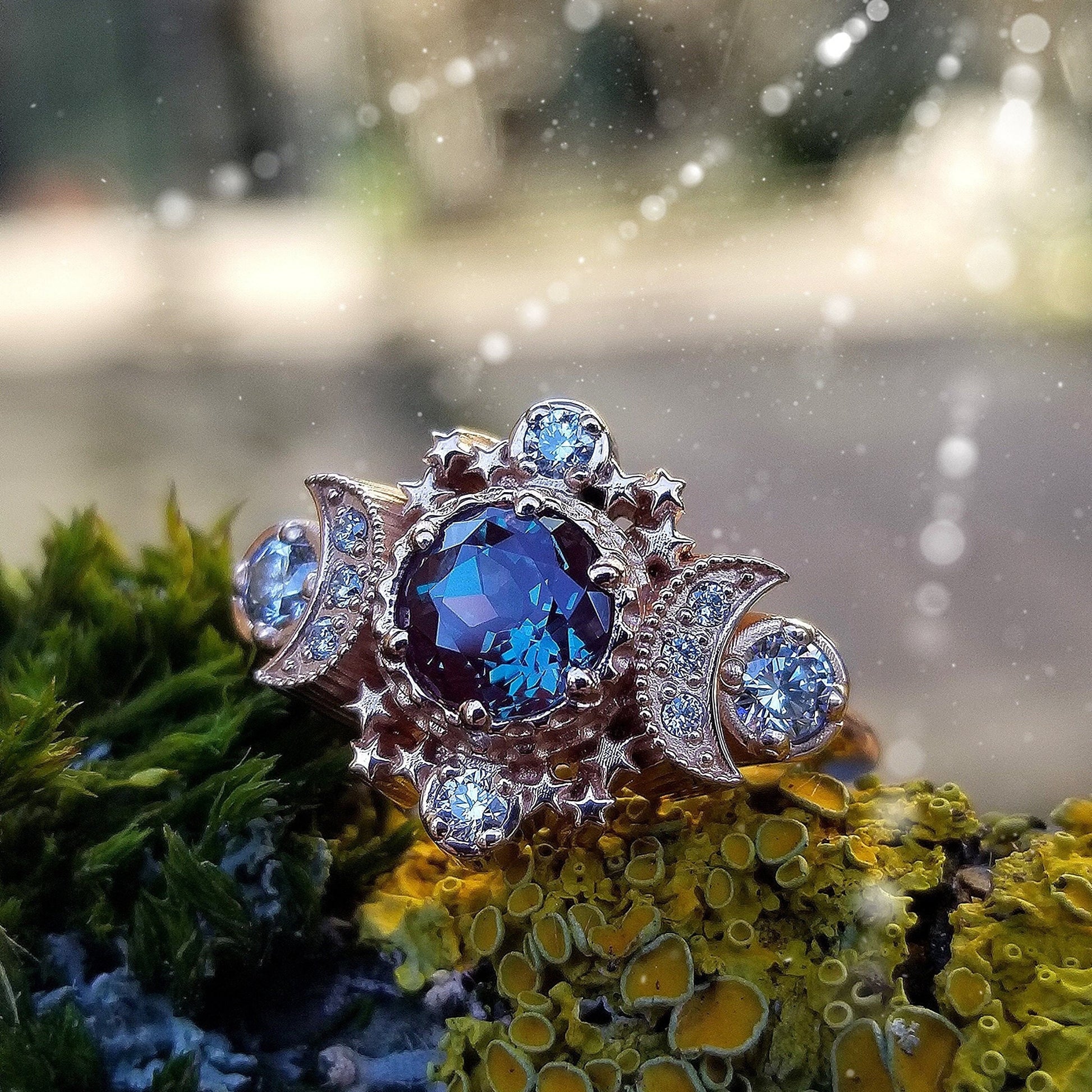 The center stone is representing the full moon and is a gorgeous color change Chatham lab Alexandrite, you can choose to have your ring set with a 6mm (shown in first photo) or 6.5mm Alexandrite. The 6mm gems weigh approximately 1.10 carats and the 6.5mm gems weigh approx. 1.3 carats. The ring is set with 10 white diamonds, they have a combined carat weight of approximately .30 carats, they are VS clarity.