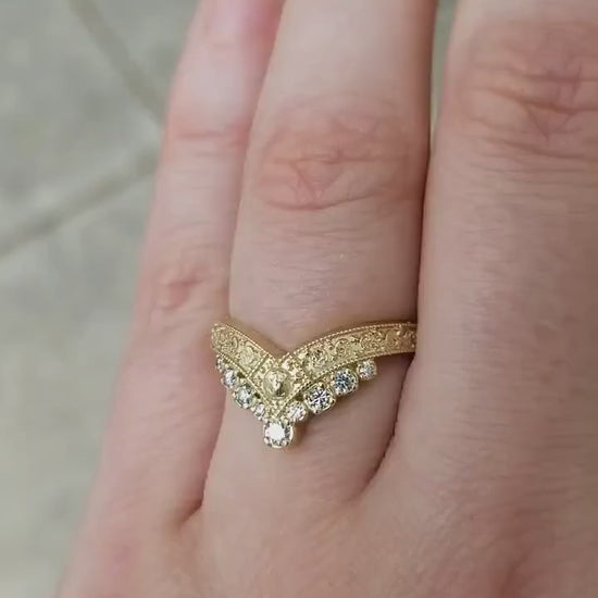 This stardust chevron was initially a custom order but turned out so gorgeous I just had to add it to the shop. The ring is set with approximately .20 carats of white diamonds, they are VS clarity and G-H in color. The chevron shaped band has a full moon right at the point and moon phases trailing back on each side with some tiny golden stardust.