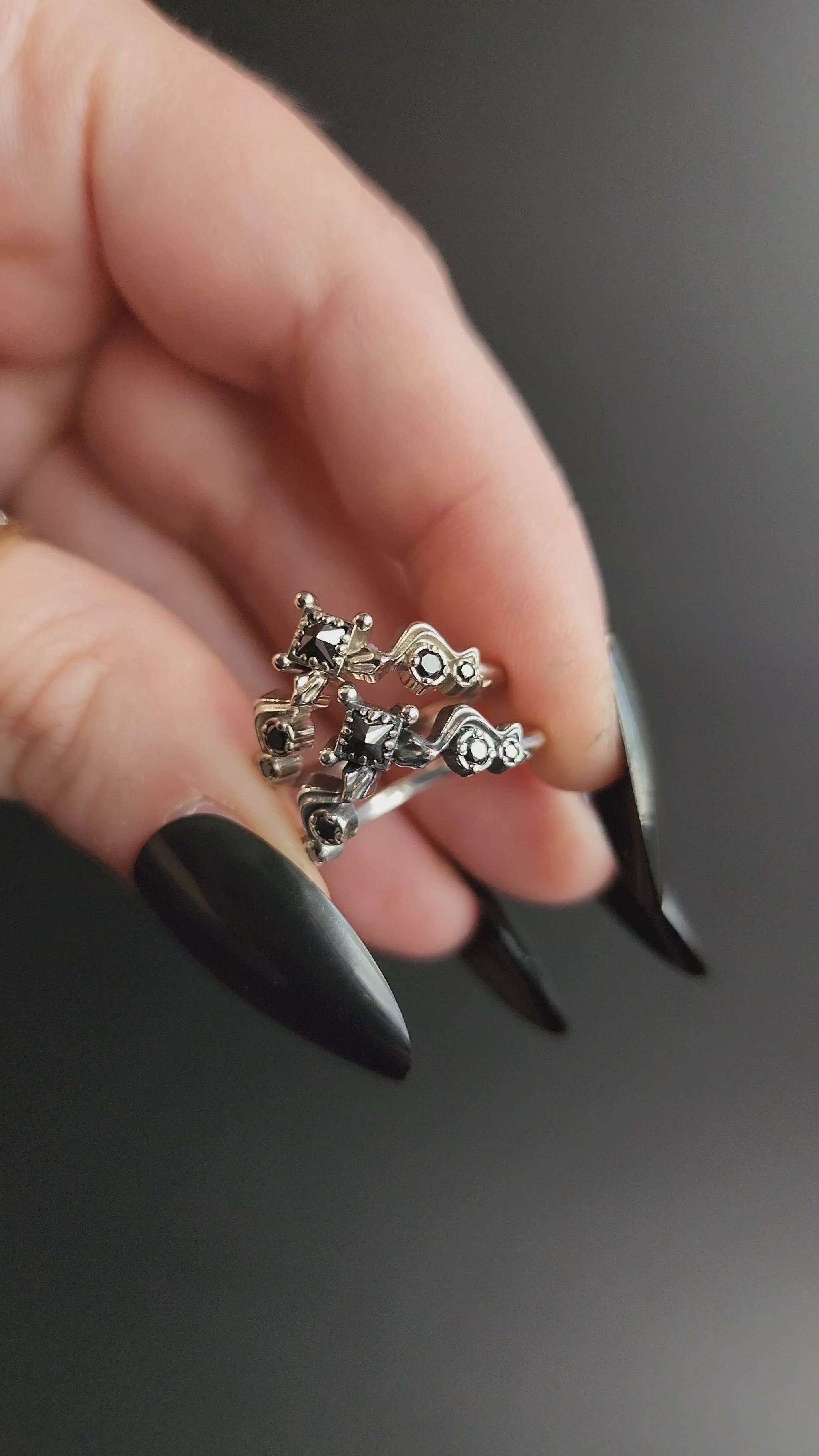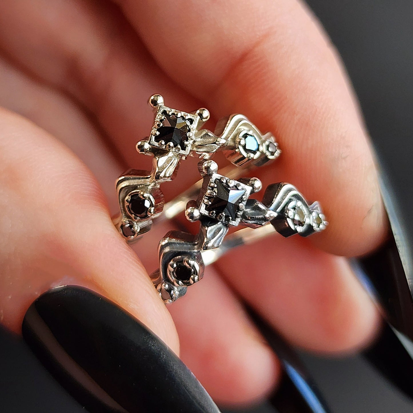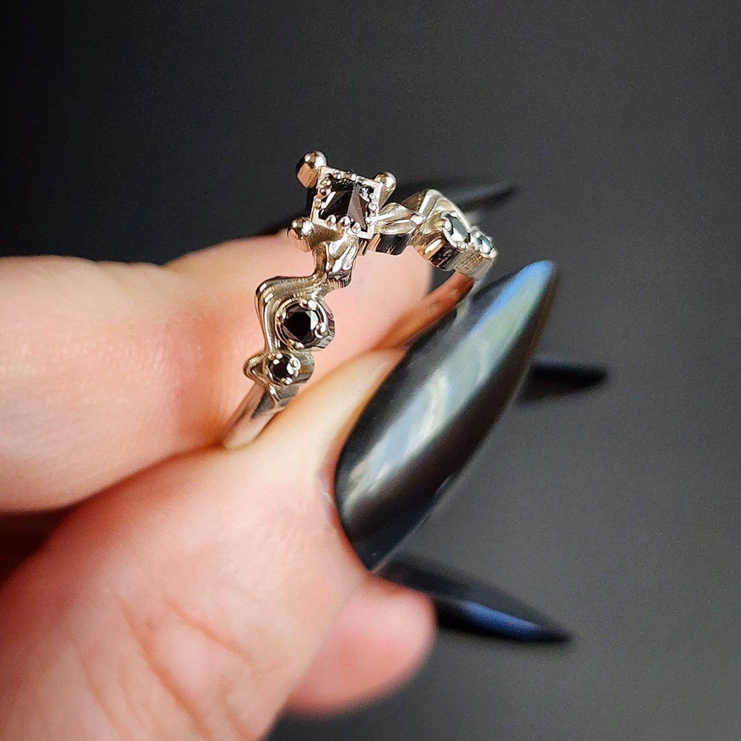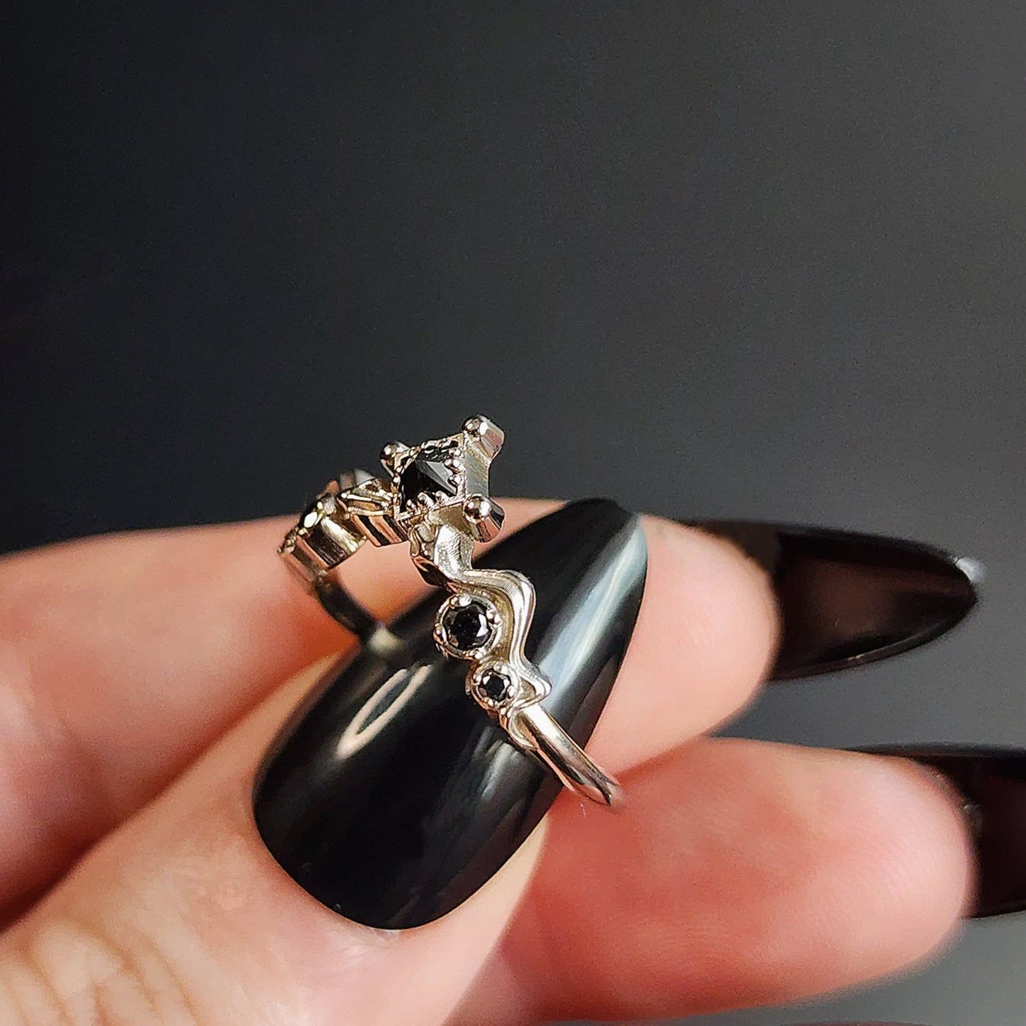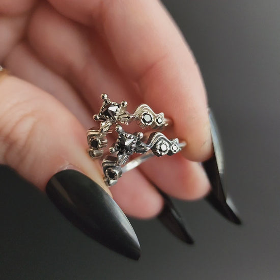 This ring is what I imagine you would find in your favorite forest Witch's jewelry box; it has two curvy snakes coming to meet at a reverse set princess cut black diamond that weighs approximately .22 carats. Nestled into the body of each snake is 4 additional black diamonds with a combined weight of approx. .12 carats.