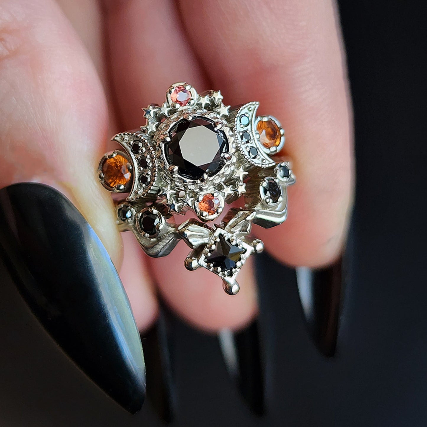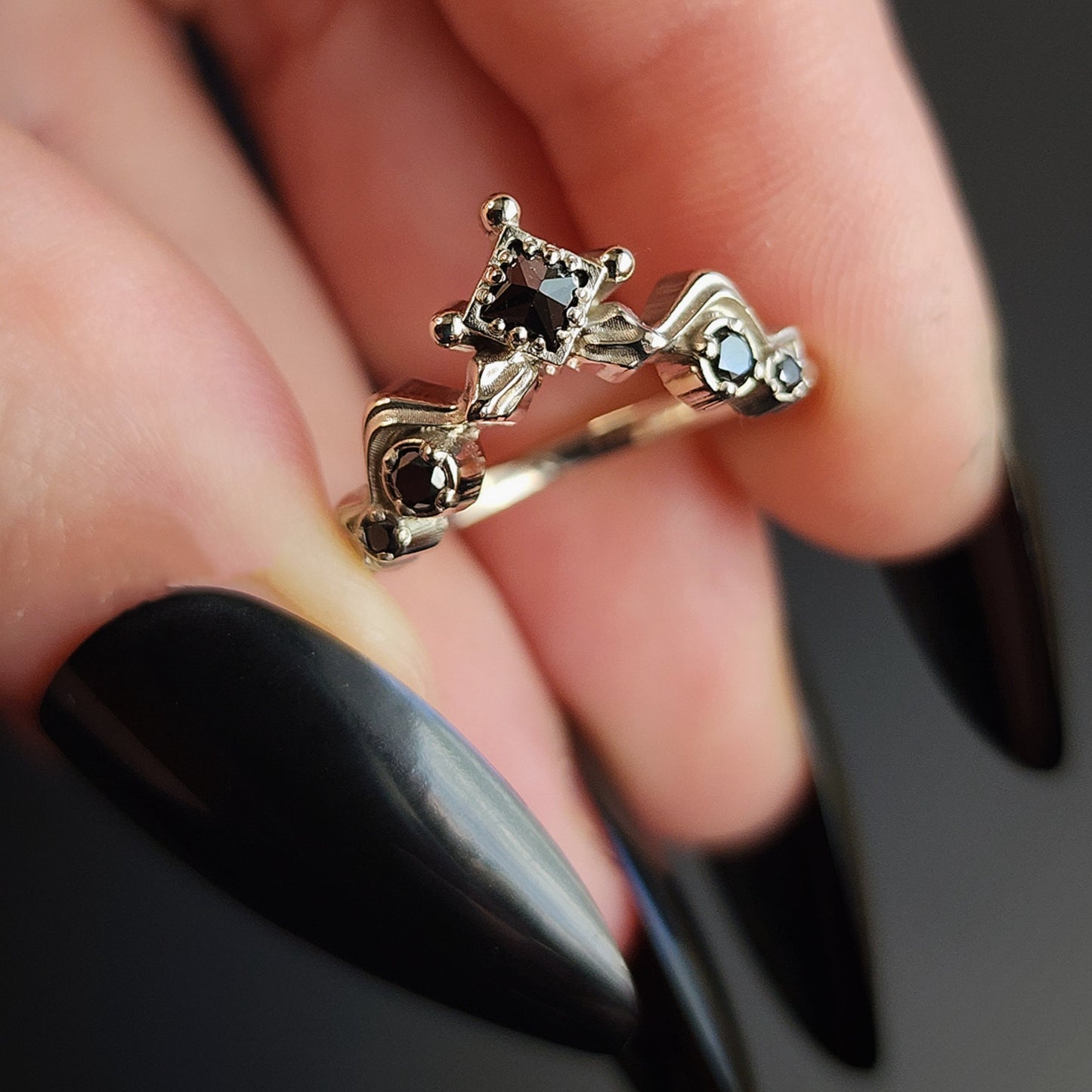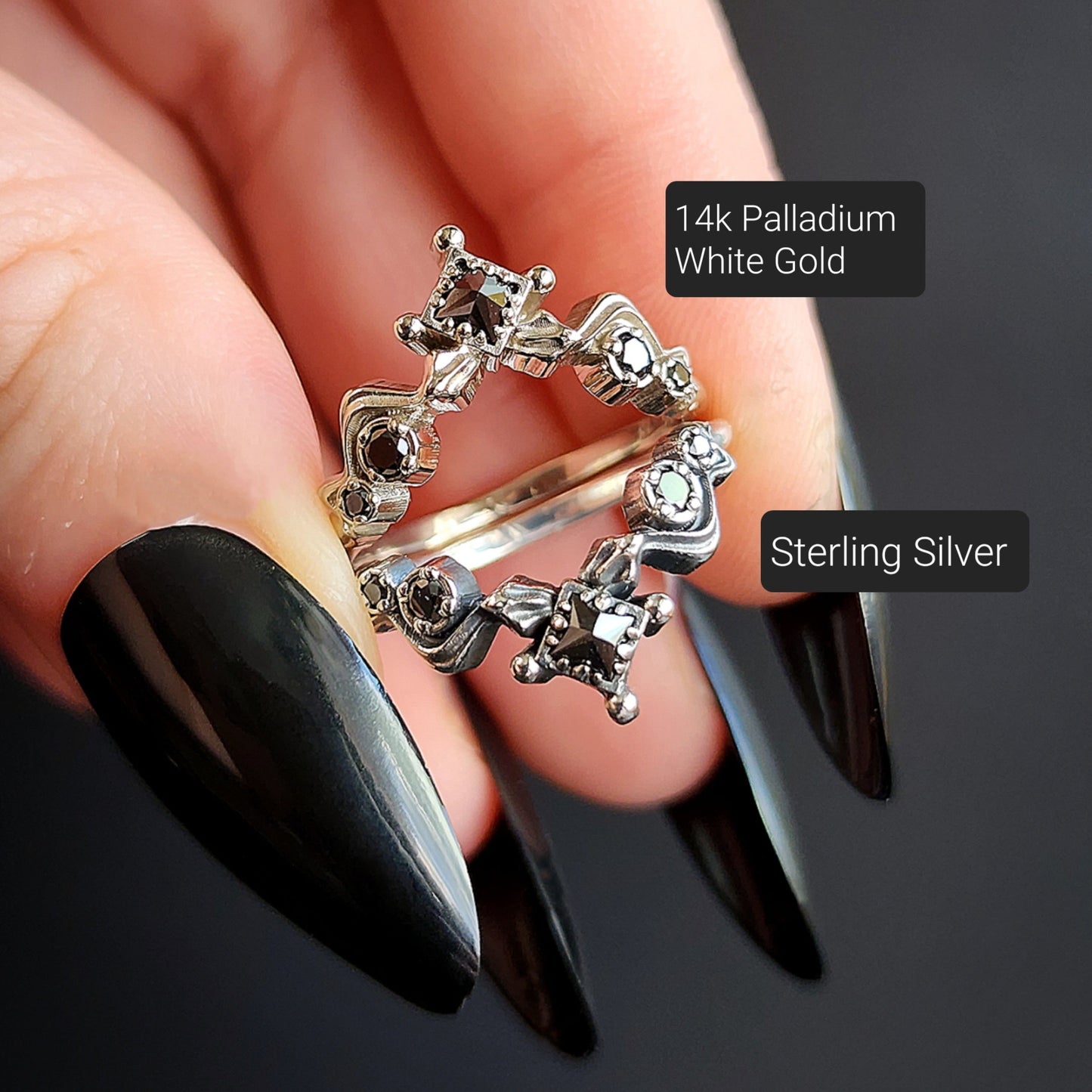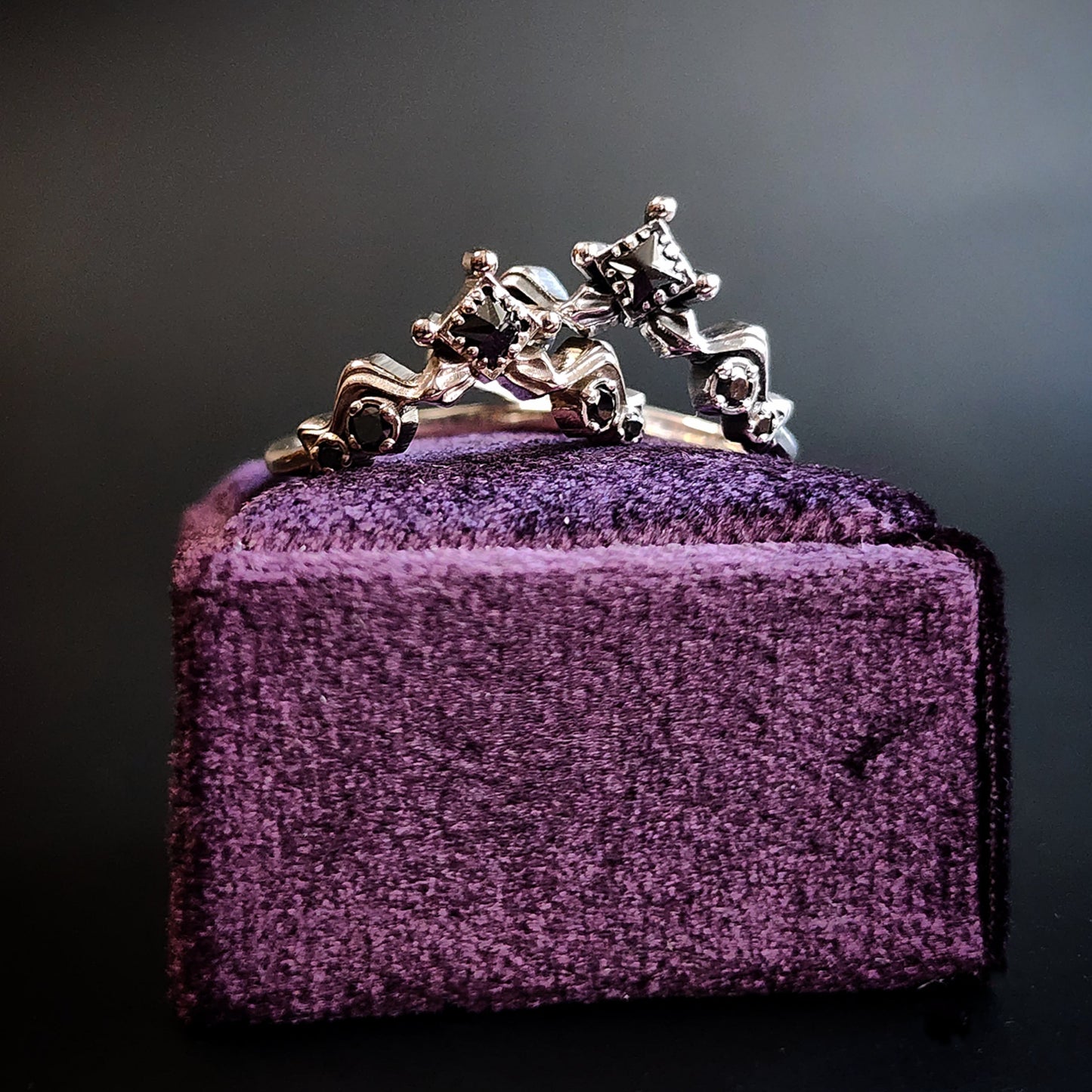 This ring is what I imagine you would find in your favorite forest Witch's jewelry box; it has two curvy snakes coming to meet at a reverse set princess cut black diamond that weighs approximately .22 carats. Nestled into the body of each snake is 4 additional black diamonds with a combined weight of approx. .12 carats.