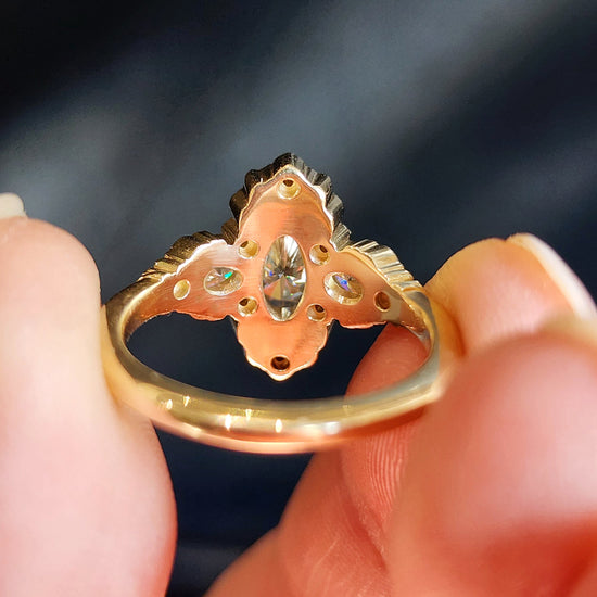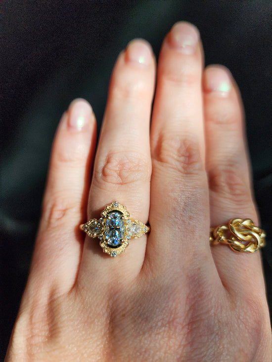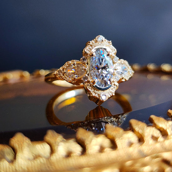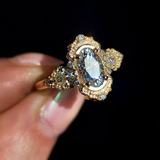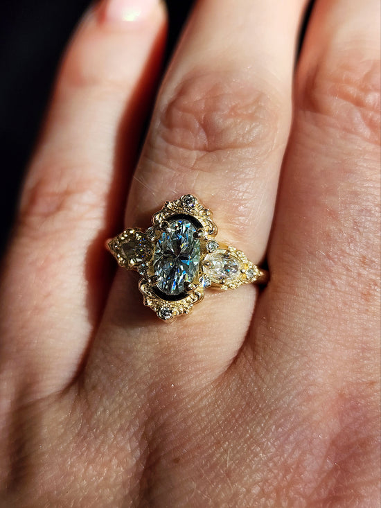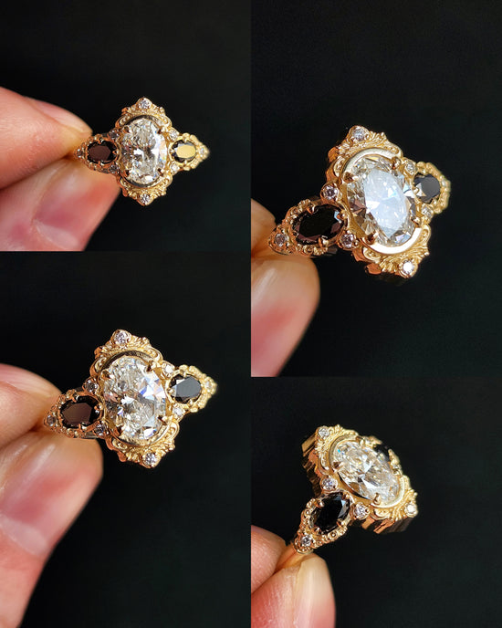 Experience old world charm with our Josephine Oval Engagement Ring. Handcrafted with 14k gold, this heirloom quality ring features an elongated oval center stone, accented by delicate gold scrolls. Its classic and fancy design is accented with tiny gold details and 8 VS natural diamonds. Can be set with black diamond accents upon request.