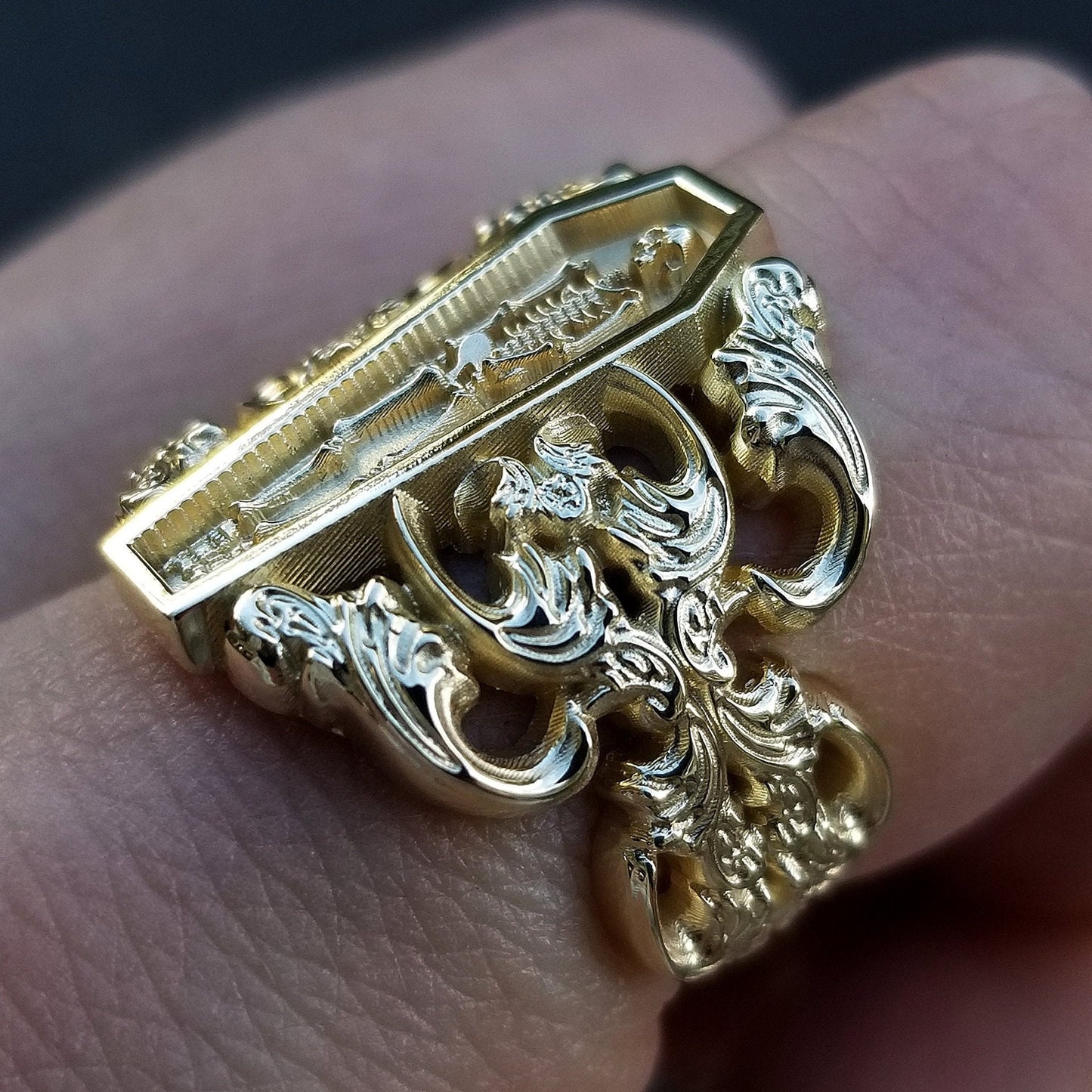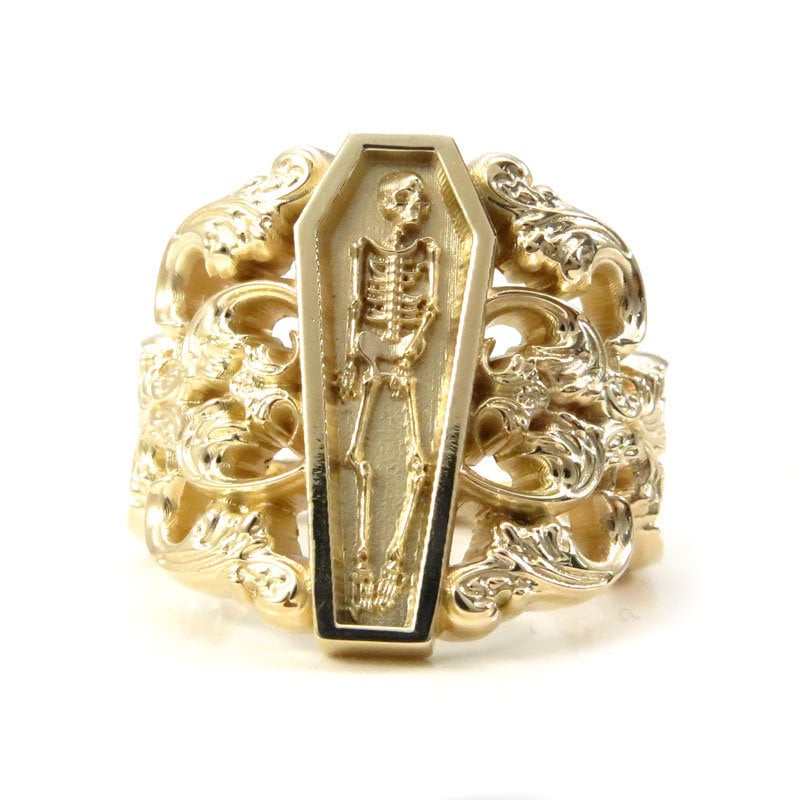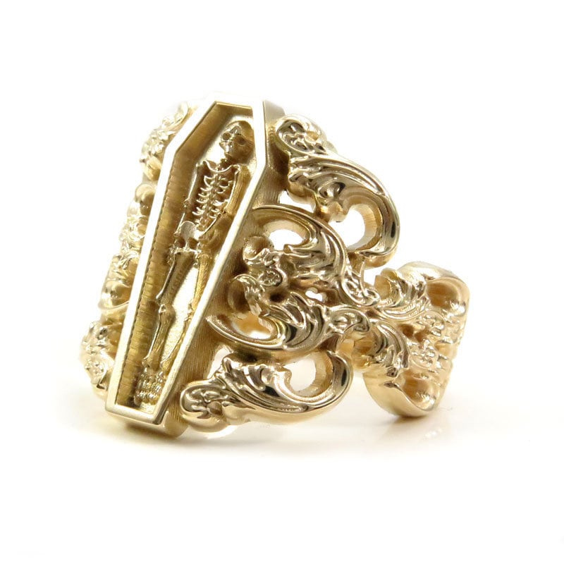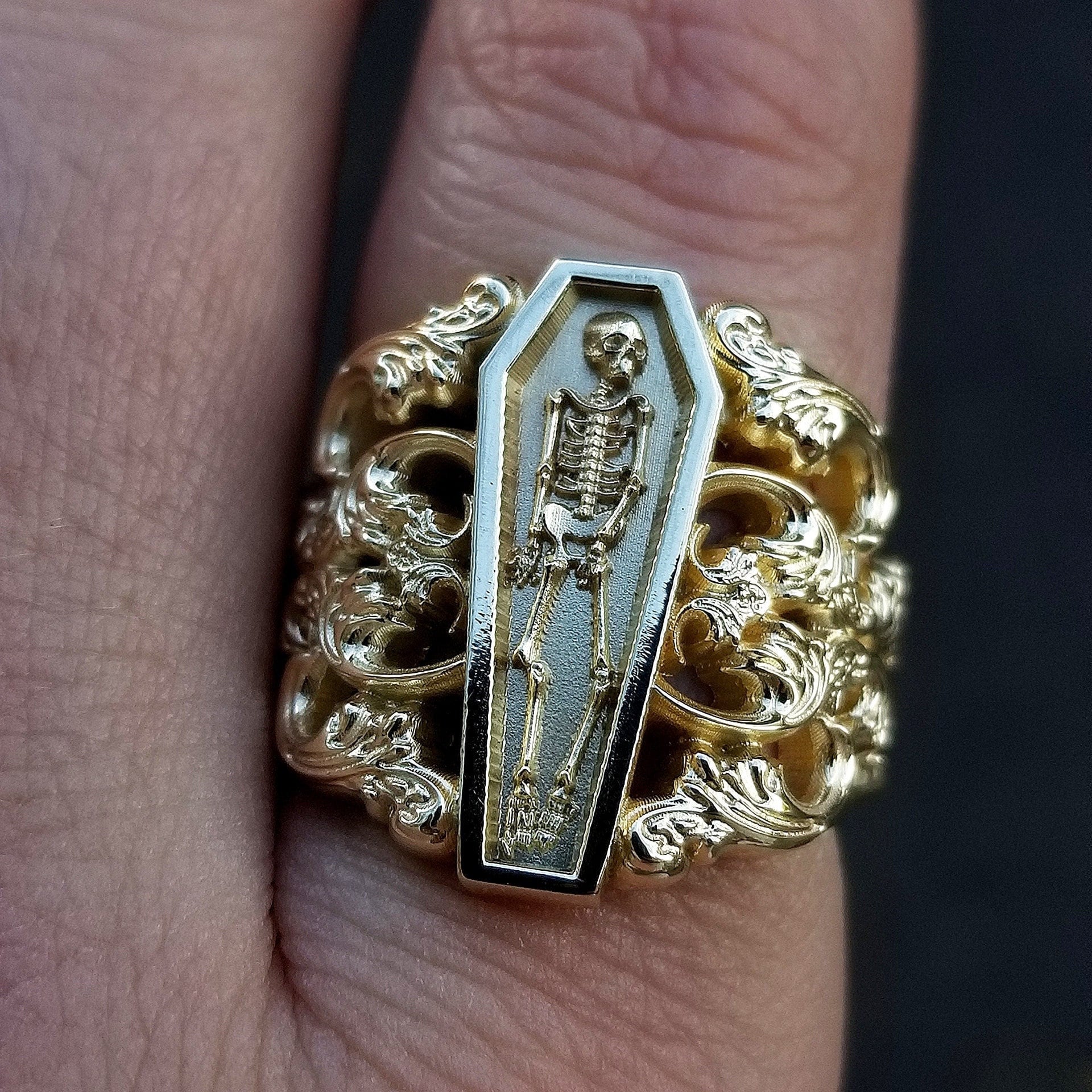 The prompt for October 16th is 'Memento Mori' so I have made a ring with decrepit skeleton laying it's coffin adorned by baroque ornate silver scrolls meant to be an ode to the Victorian era of Mourning jewelry.
