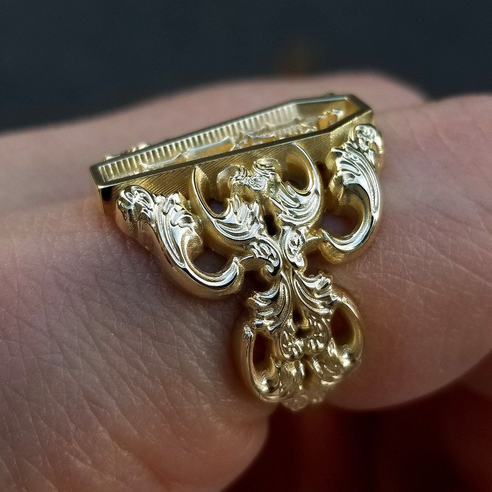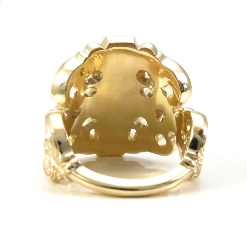 The ring is cast in solid 14k gold, the ring in the photos is 14k yellow gold but it can also be cast in 14k rose or 14k palladium white gold.