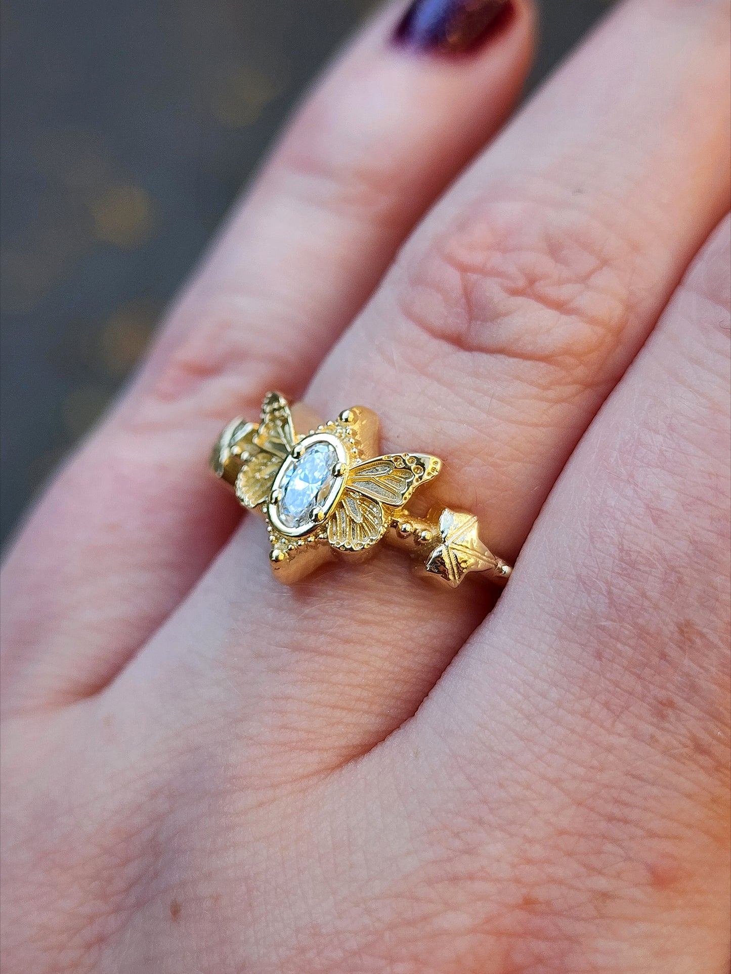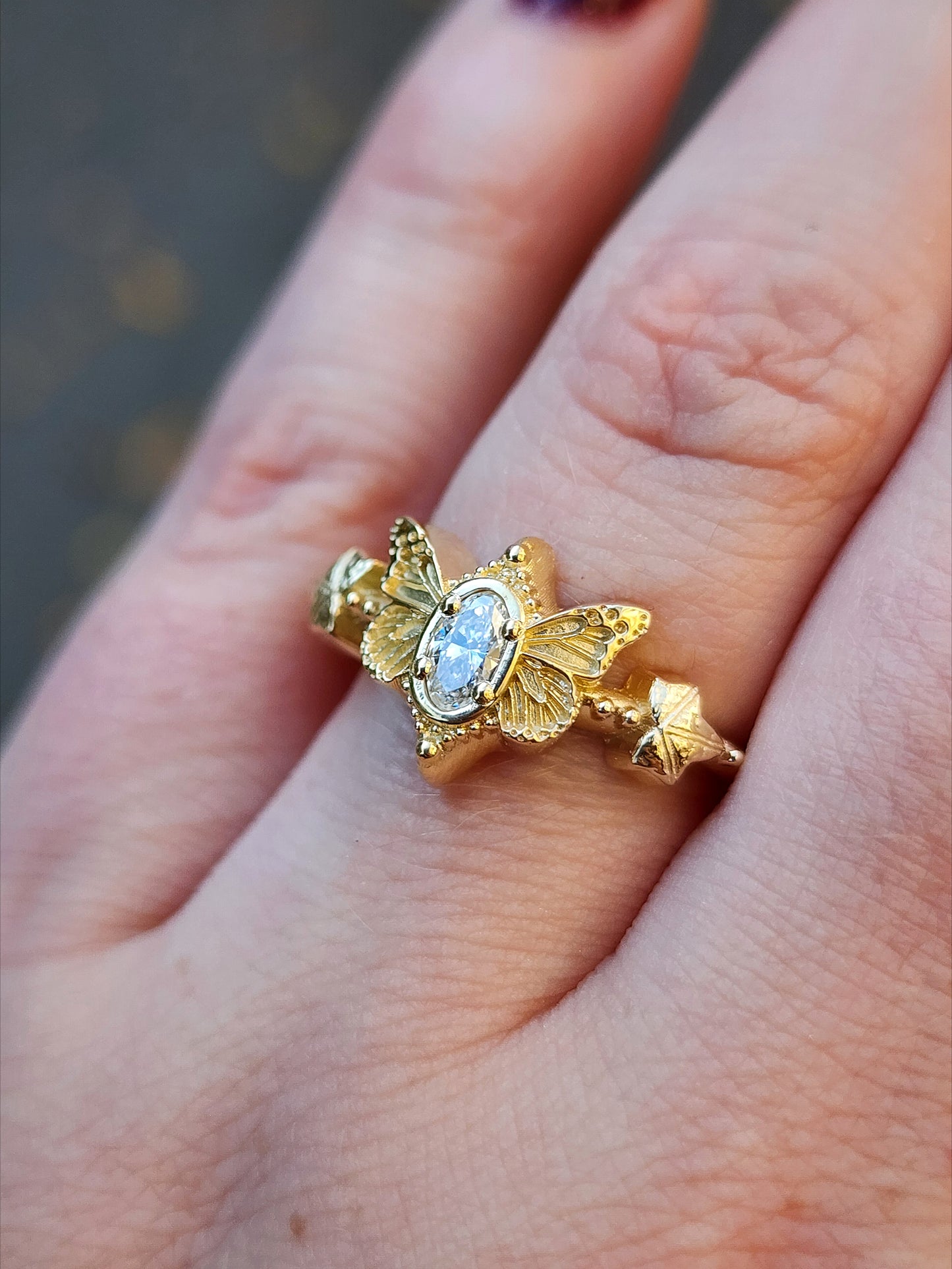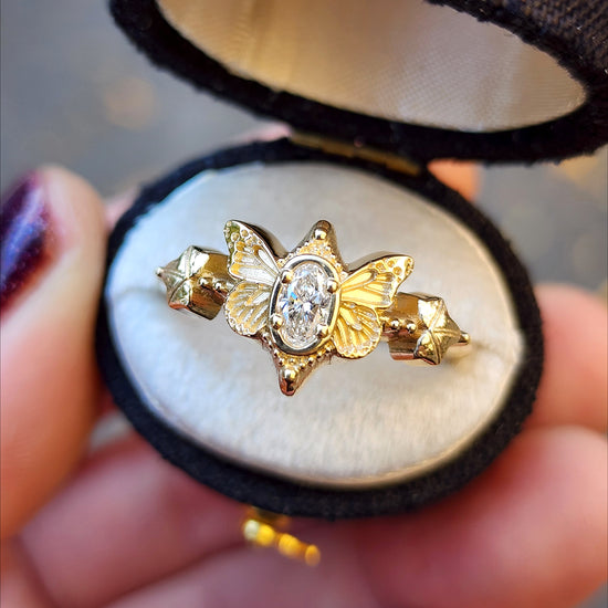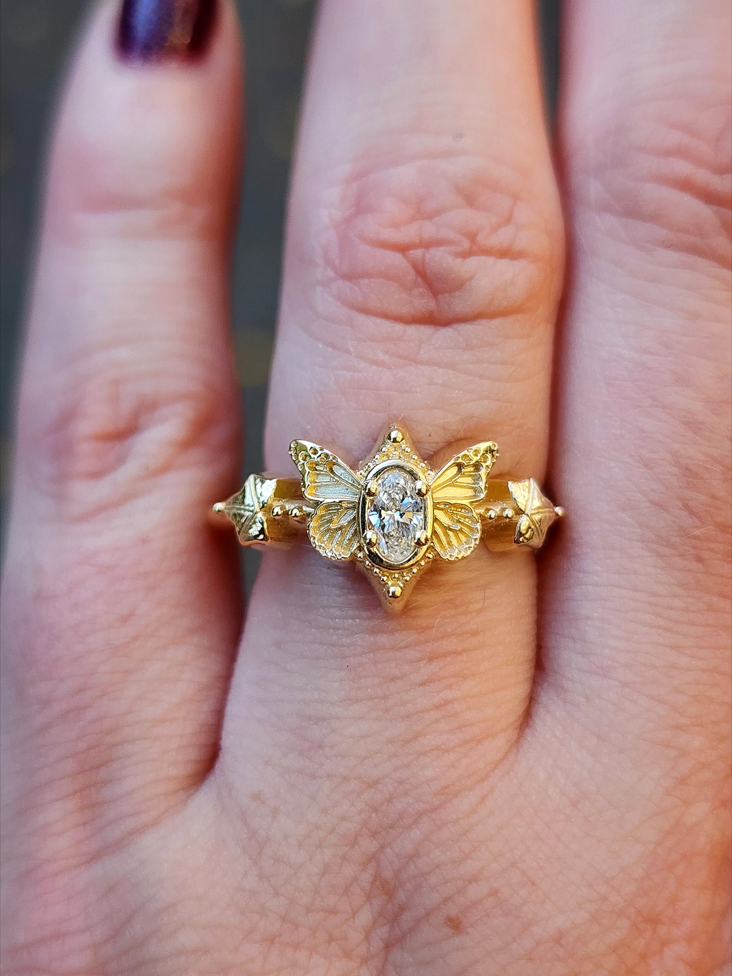 This cute ring has very detailed butterfly wings on either side of a VS/FG oval lab diamond. On either side of the butterfly is a tiny Ivy leaf with 2 tiny gemstones.