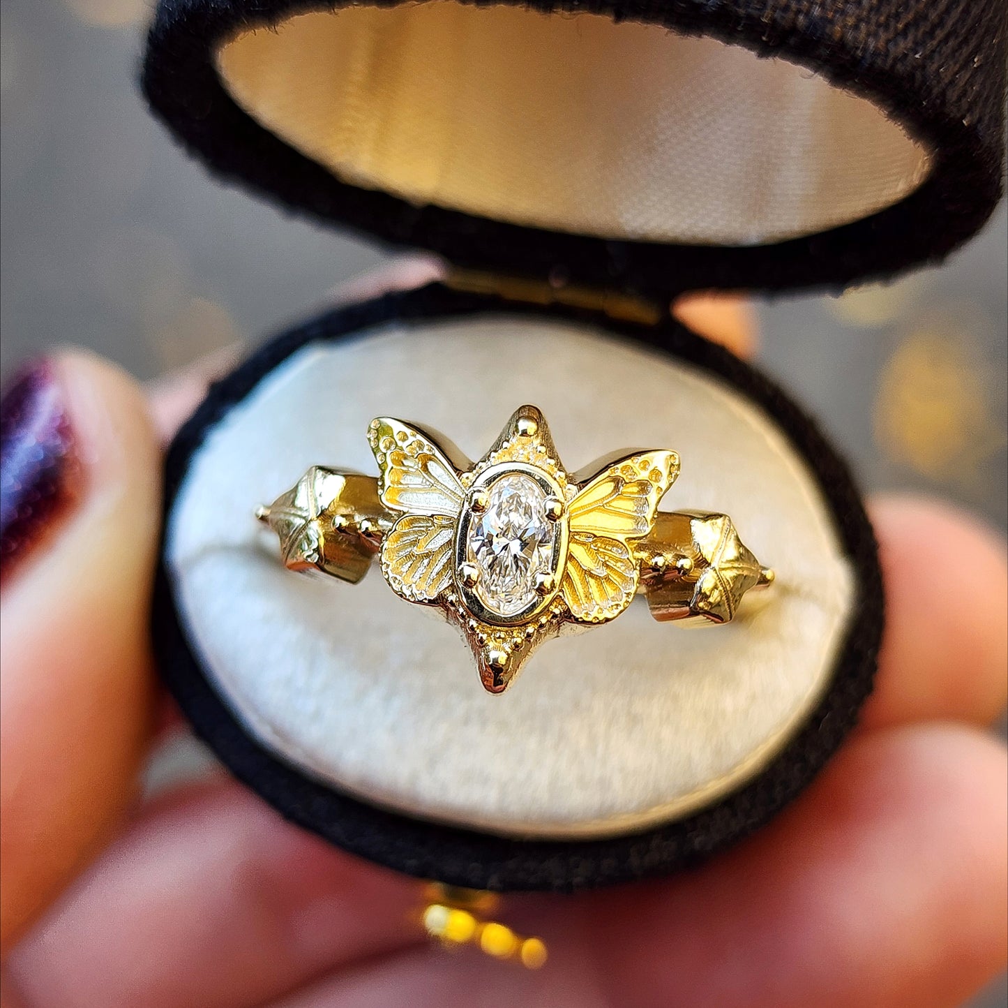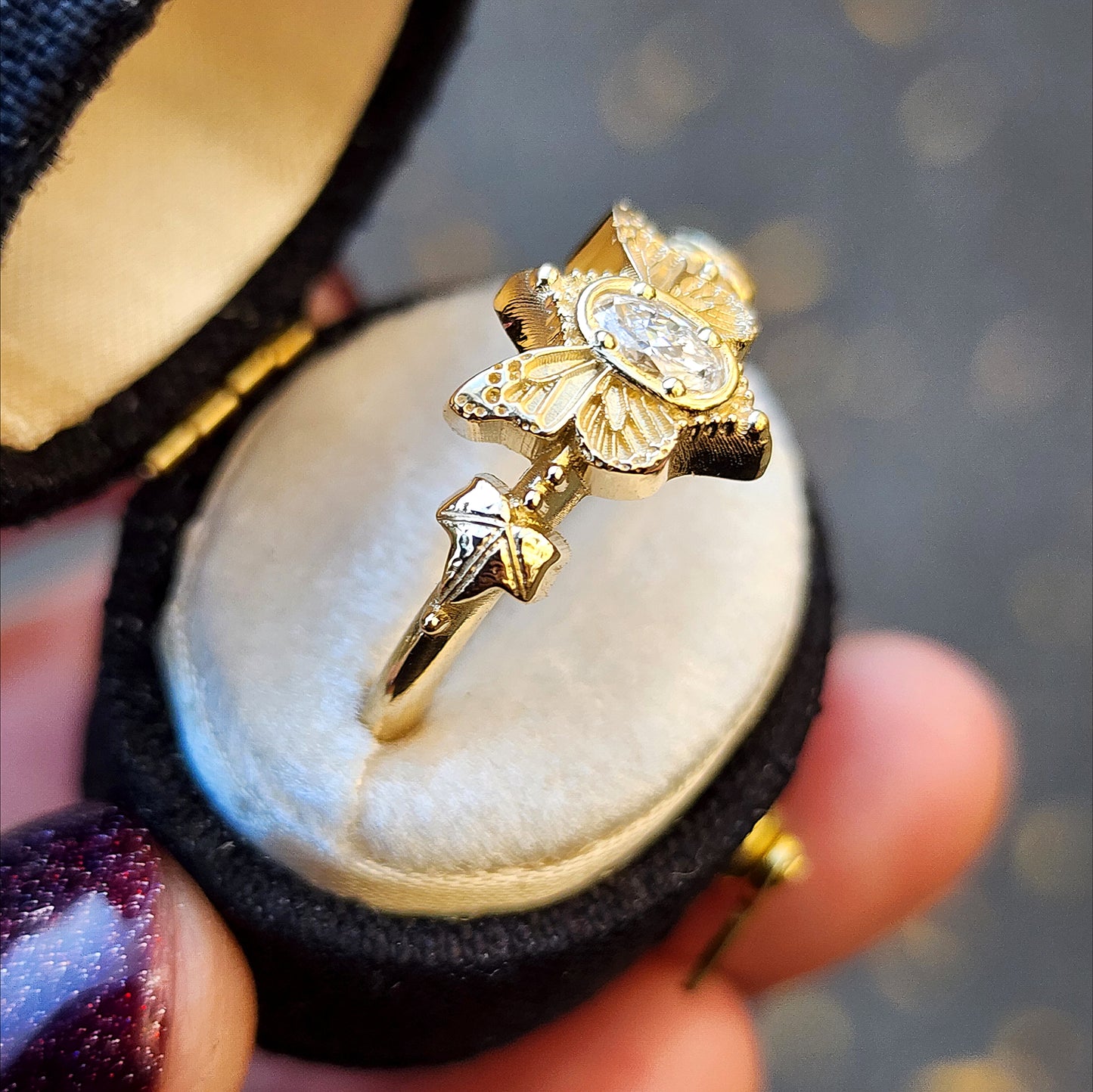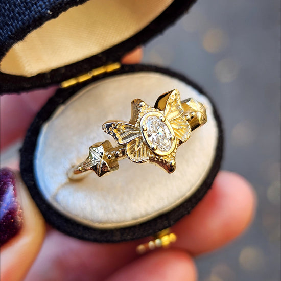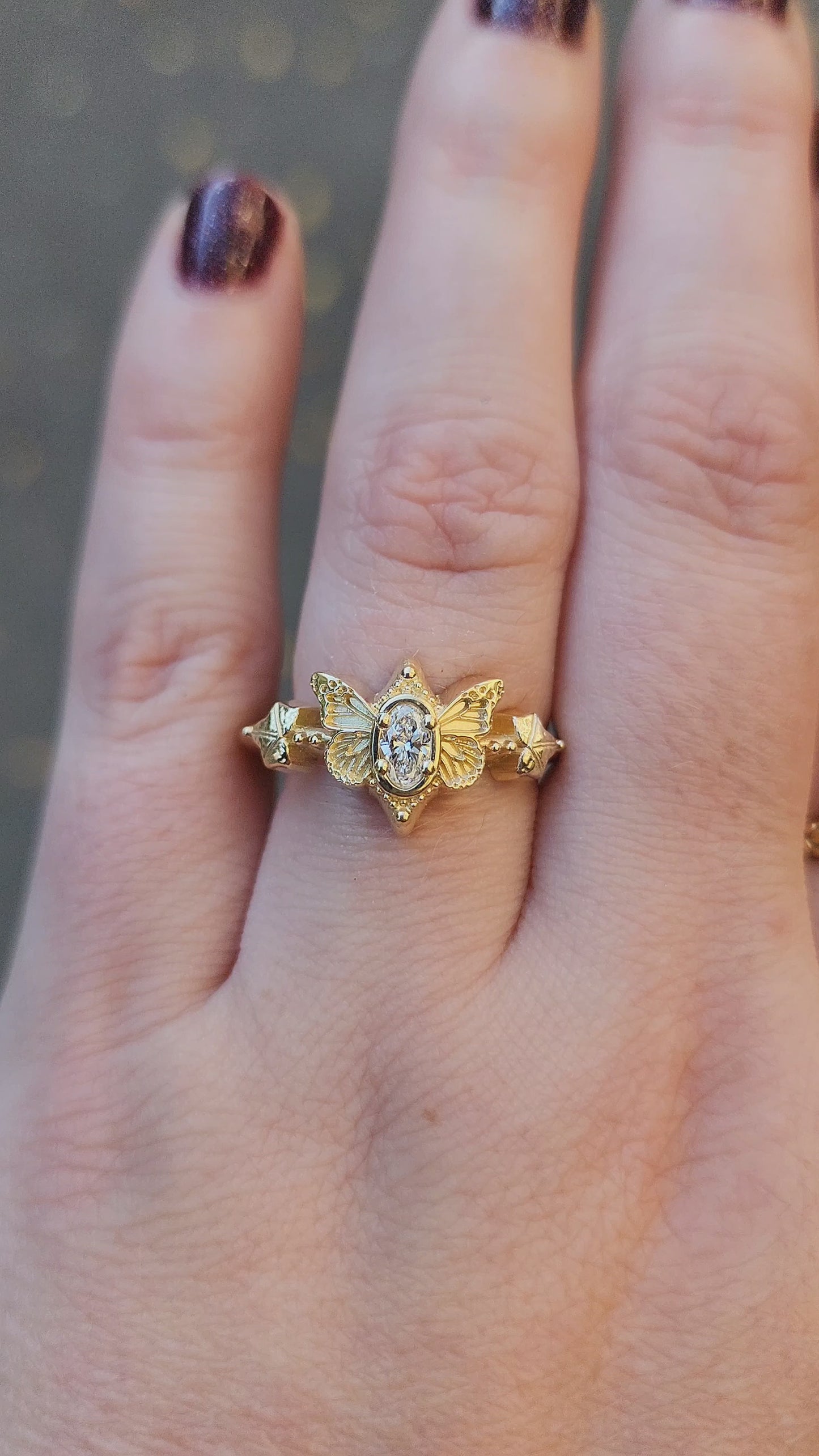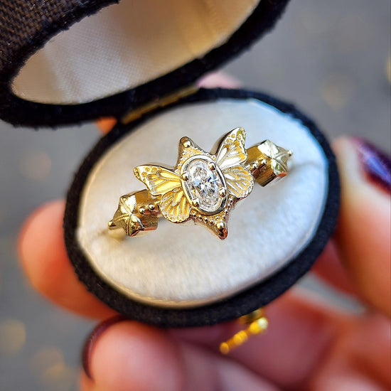 This cute ring has very detailed butterfly wings on either side of a VS/FG oval lab diamond. On either side of the butterfly is a tiny Ivy leaf with 2 tiny gemstones.