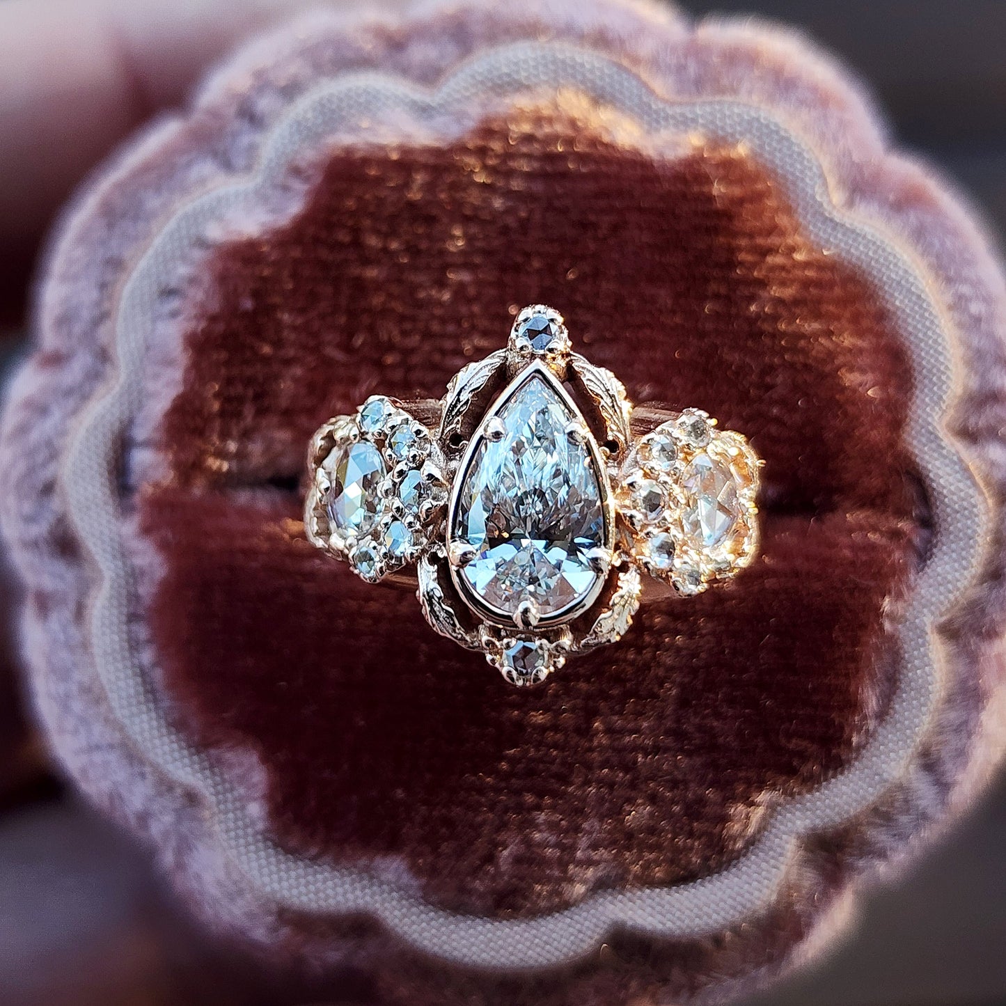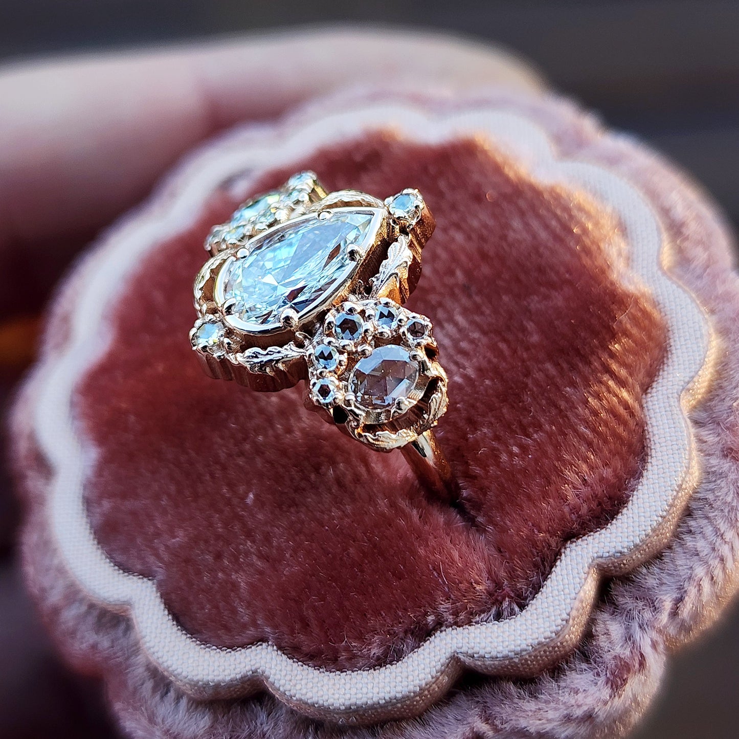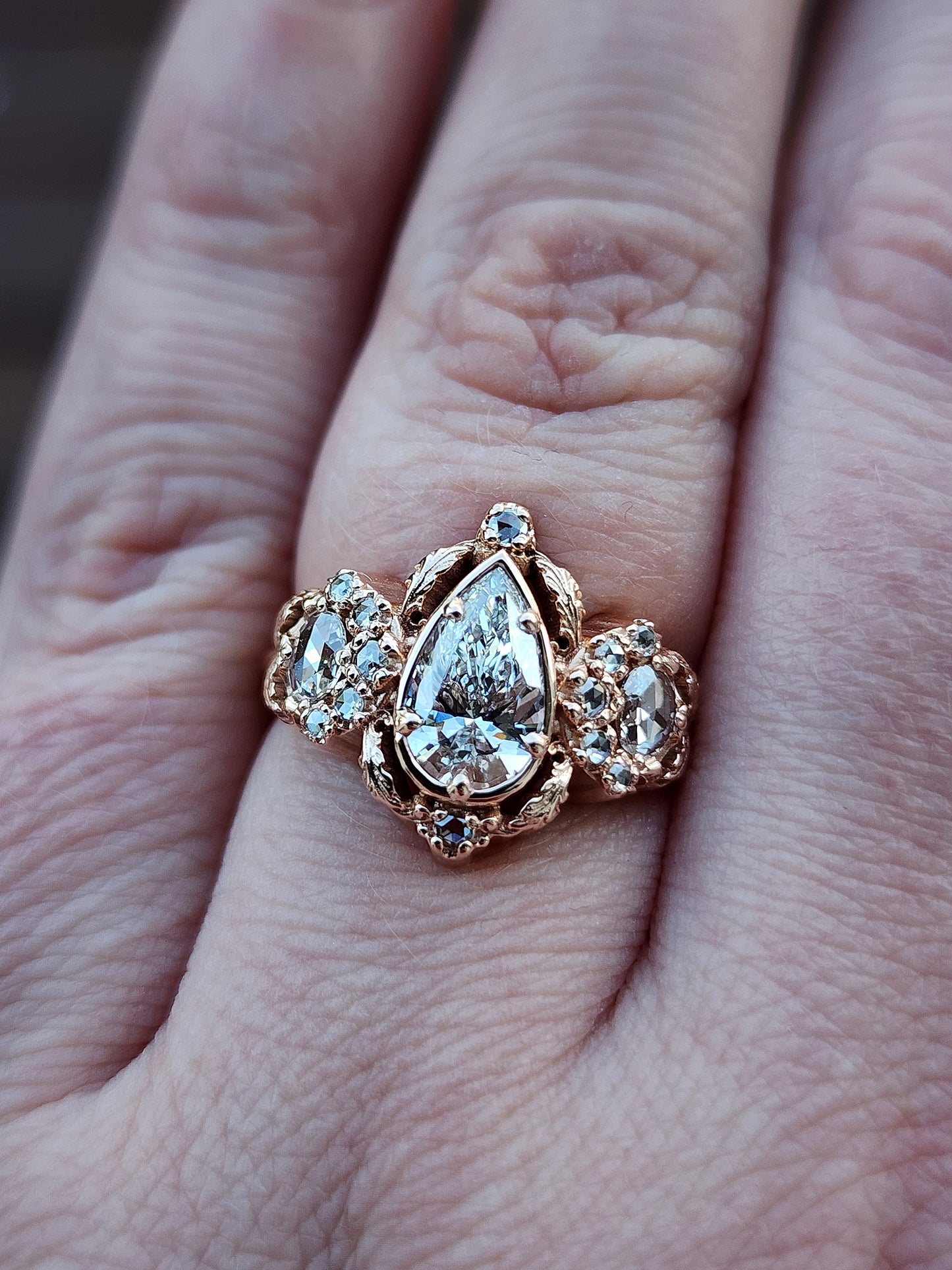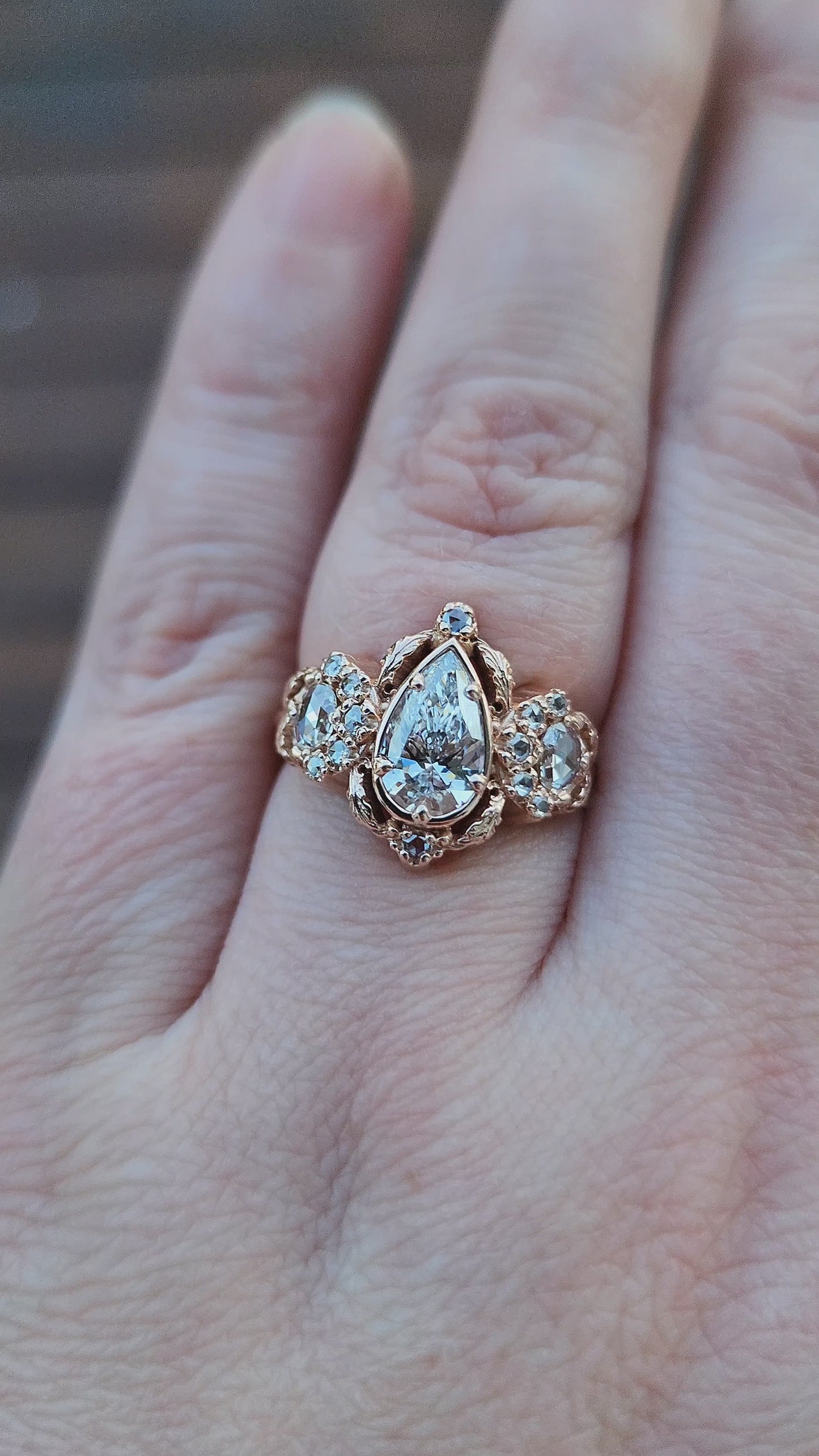 Goodnight Moon Ring, inspired by antique design, its rose cut diamond sides and 14k gold filigree scrollwork create a fantasy feel. The side stones are natural VS/SI rose cut diamonds that have a combined weight of .30cts approx. The center stone of the Moon ring is a .80ct E/VS2 pear cut lab diamond that comes with a report.
