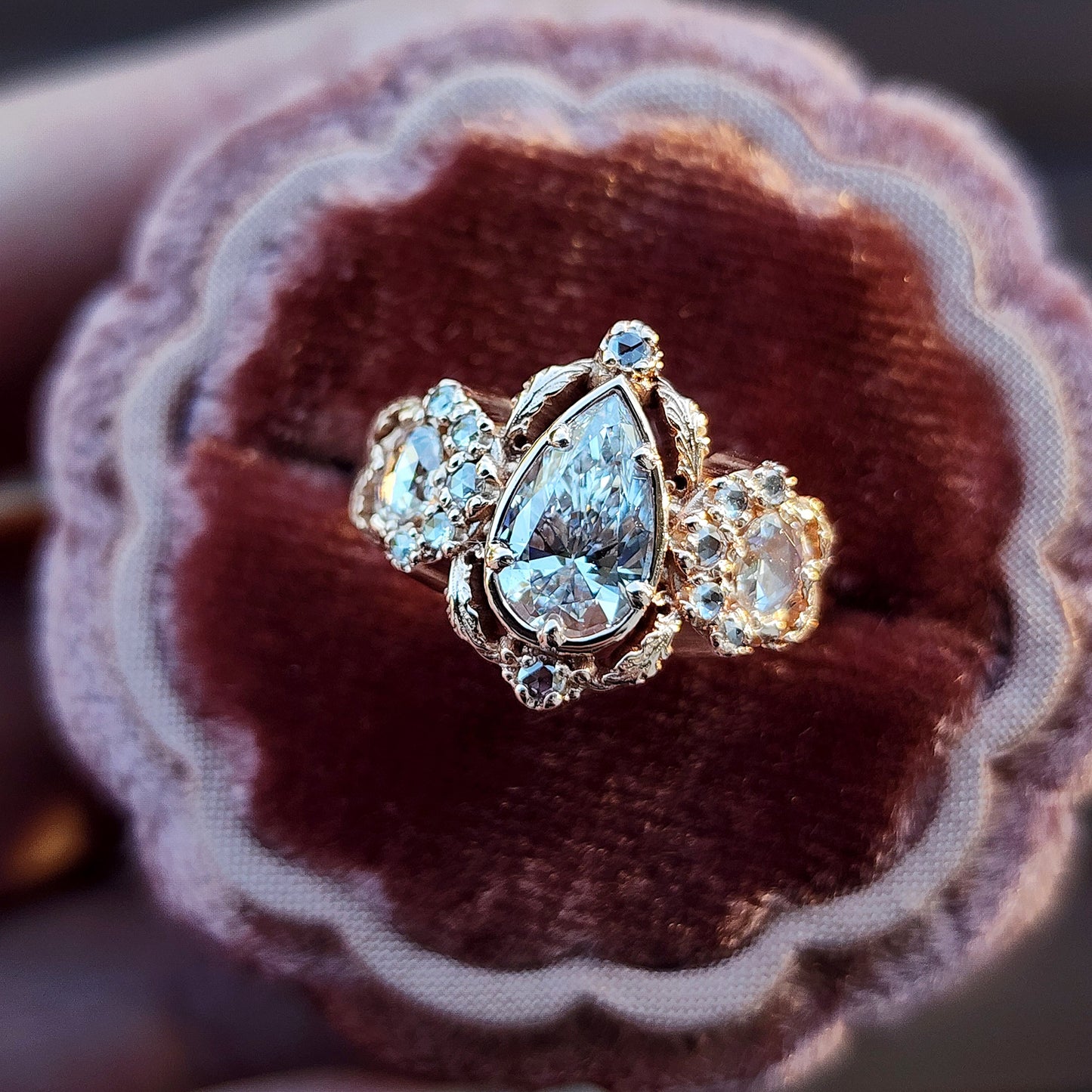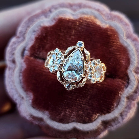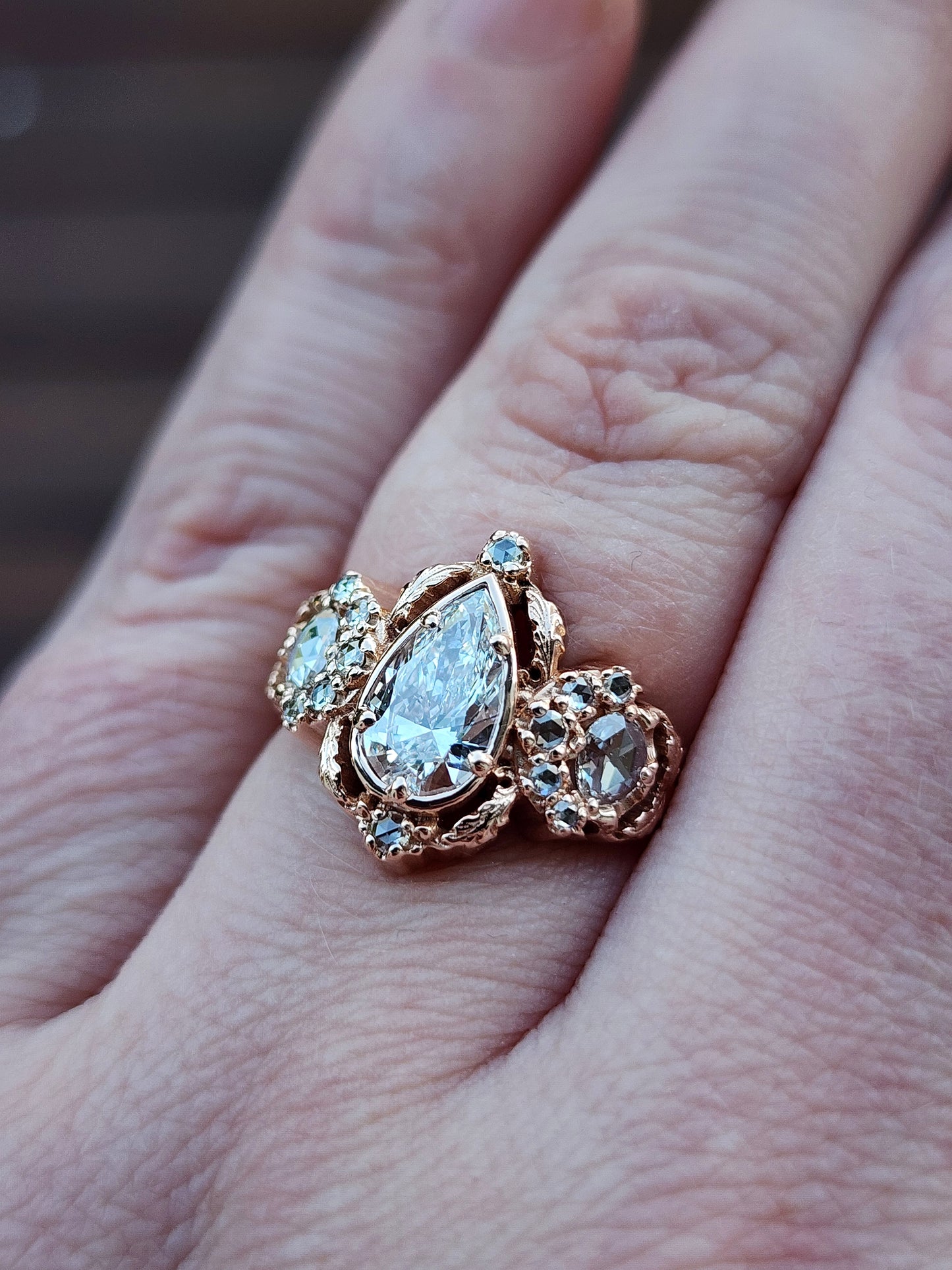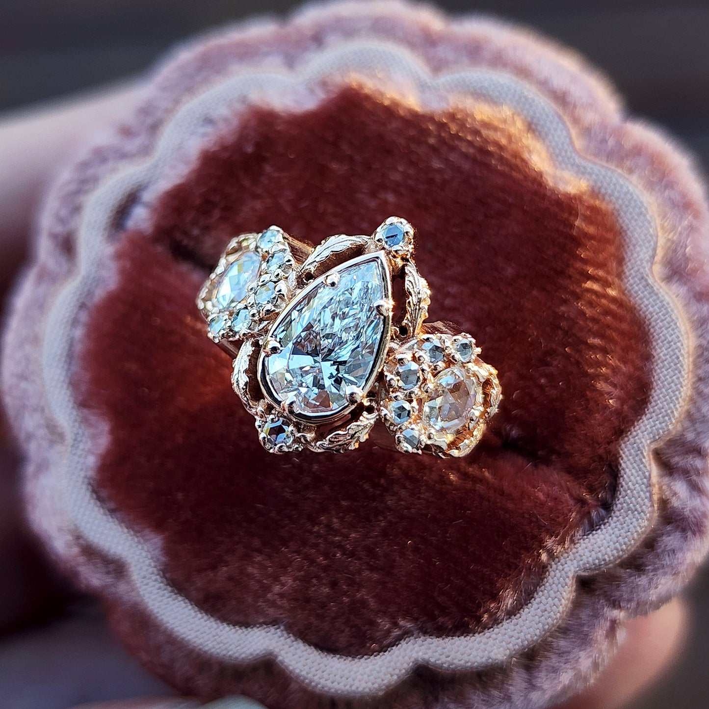 Goodnight Moon Ring, inspired by antique design, its rose cut diamond sides and 14k gold filigree scrollwork create a fantasy feel. The side stones are natural VS/SI rose cut diamonds that have a combined weight of .30cts approx. The center stone of the Moon ring is a .80ct E/VS2 pear cut lab diamond that comes with a report.