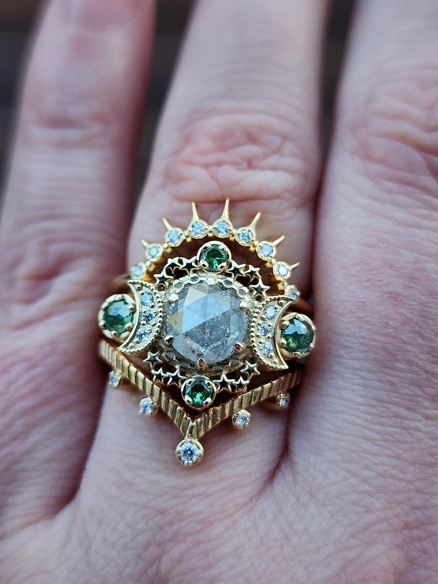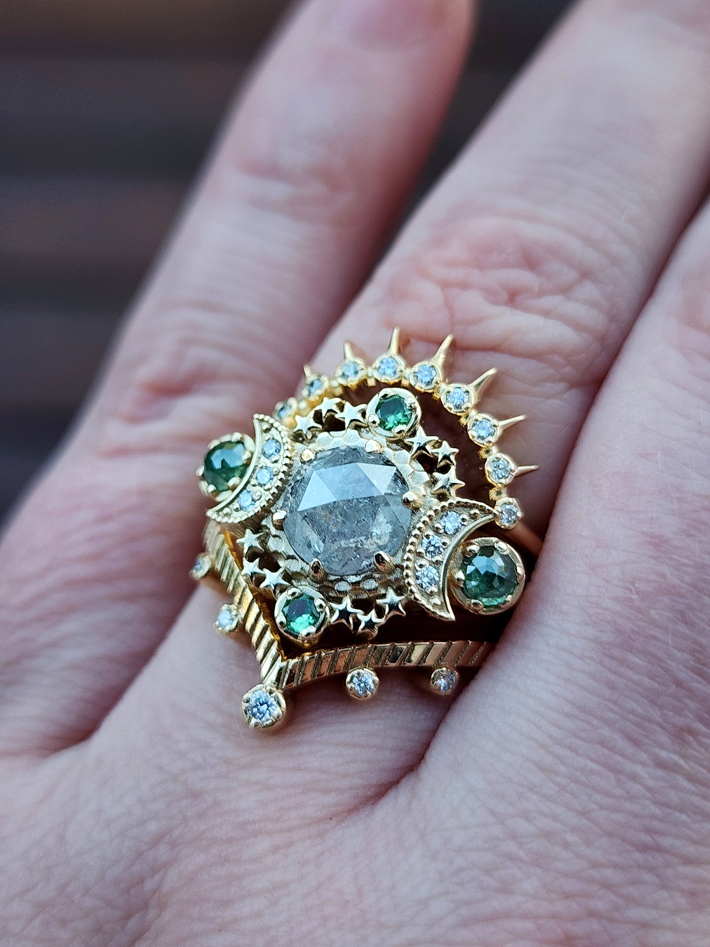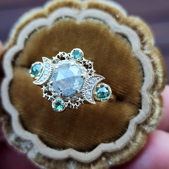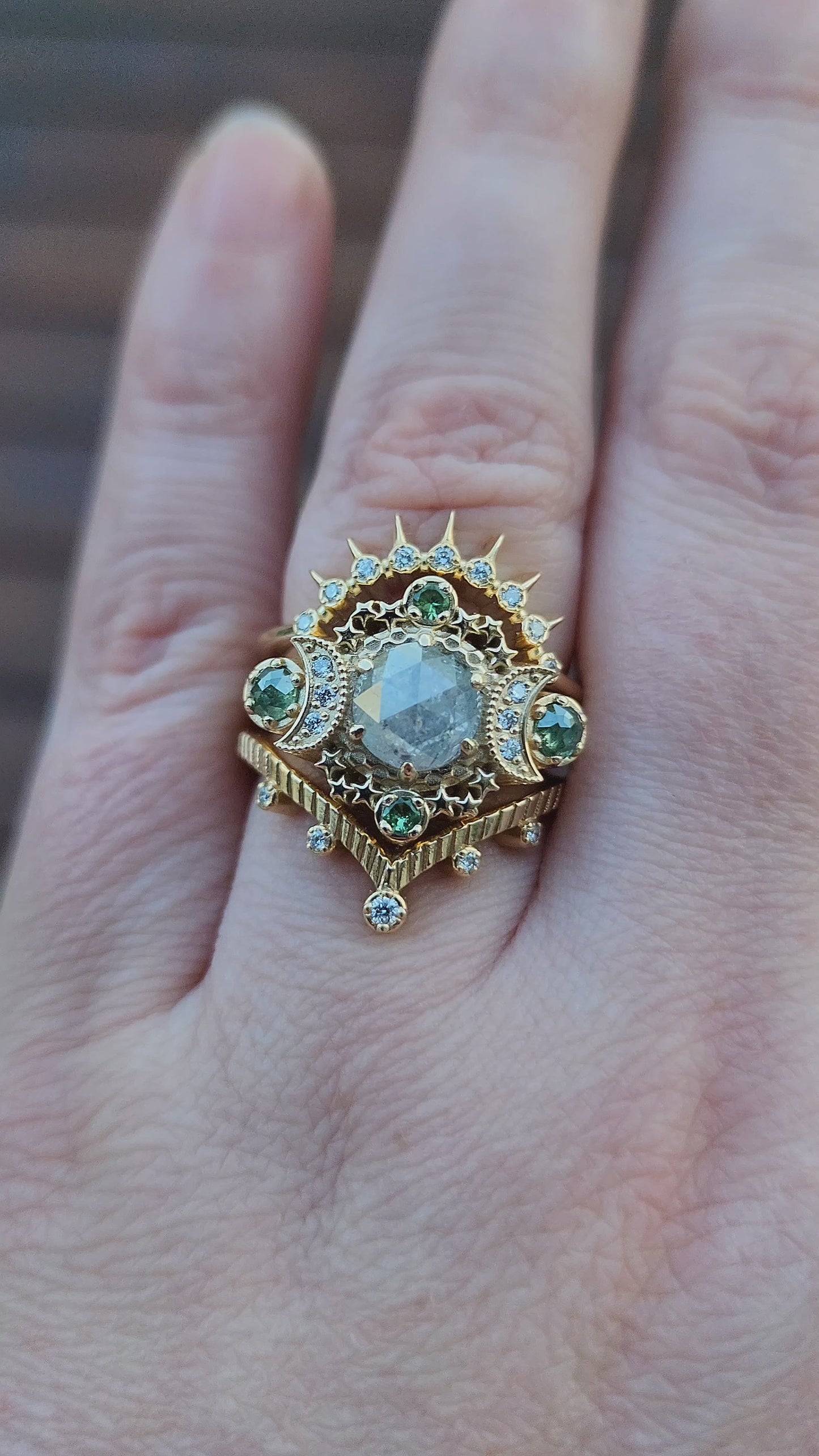 The center stone is a beautiful natural rose cut salt and pepper diamond that weighs 1.38 cts. In the cup of each moon is an irradiated rose cut green diamond, .35ct combined weight. Above and below the center stone is a natural Merelani mint garnet, .08cttw. And the crescent moons are set with natural VS white diamonds.