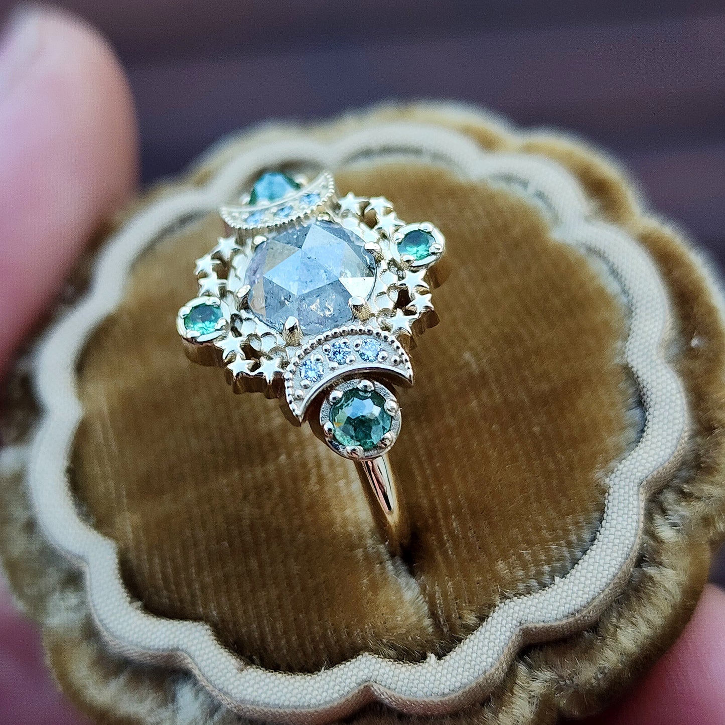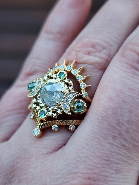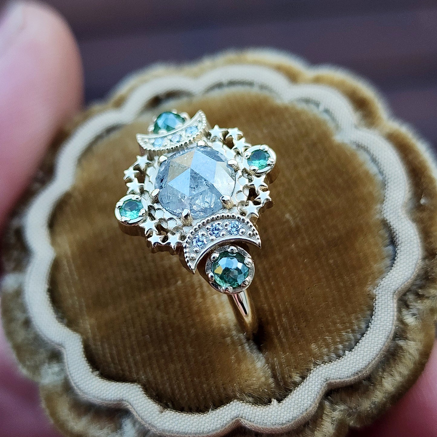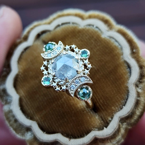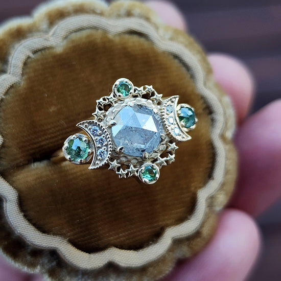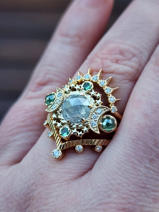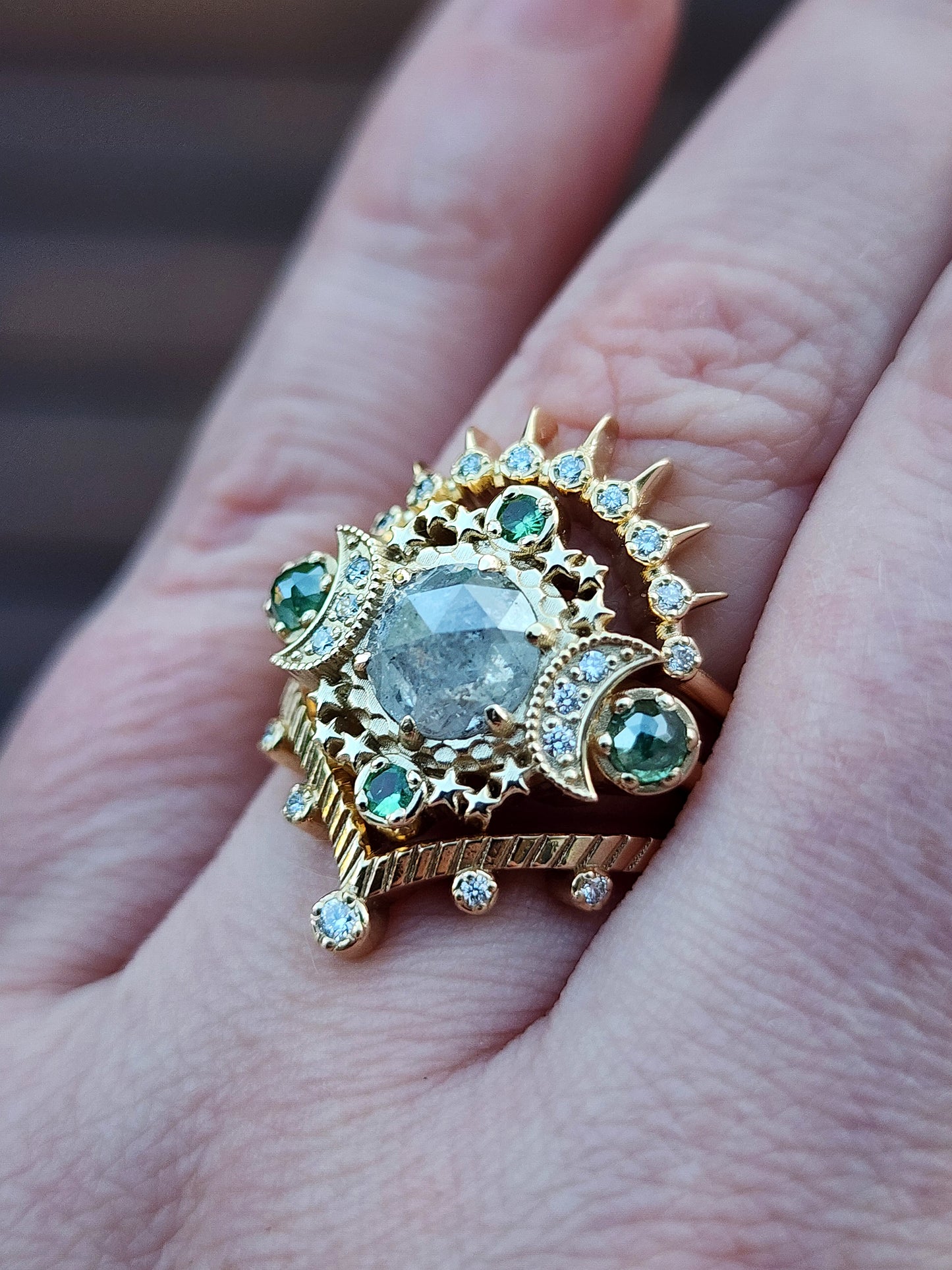 The center stone is a beautiful natural rose cut salt and pepper diamond that weighs 1.38 cts. In the cup of each moon is an irradiated rose cut green diamond, .35ct combined weight. Above and below the center stone is a natural Merelani mint garnet, .08cttw. And the crescent moons are set with natural VS white diamonds.