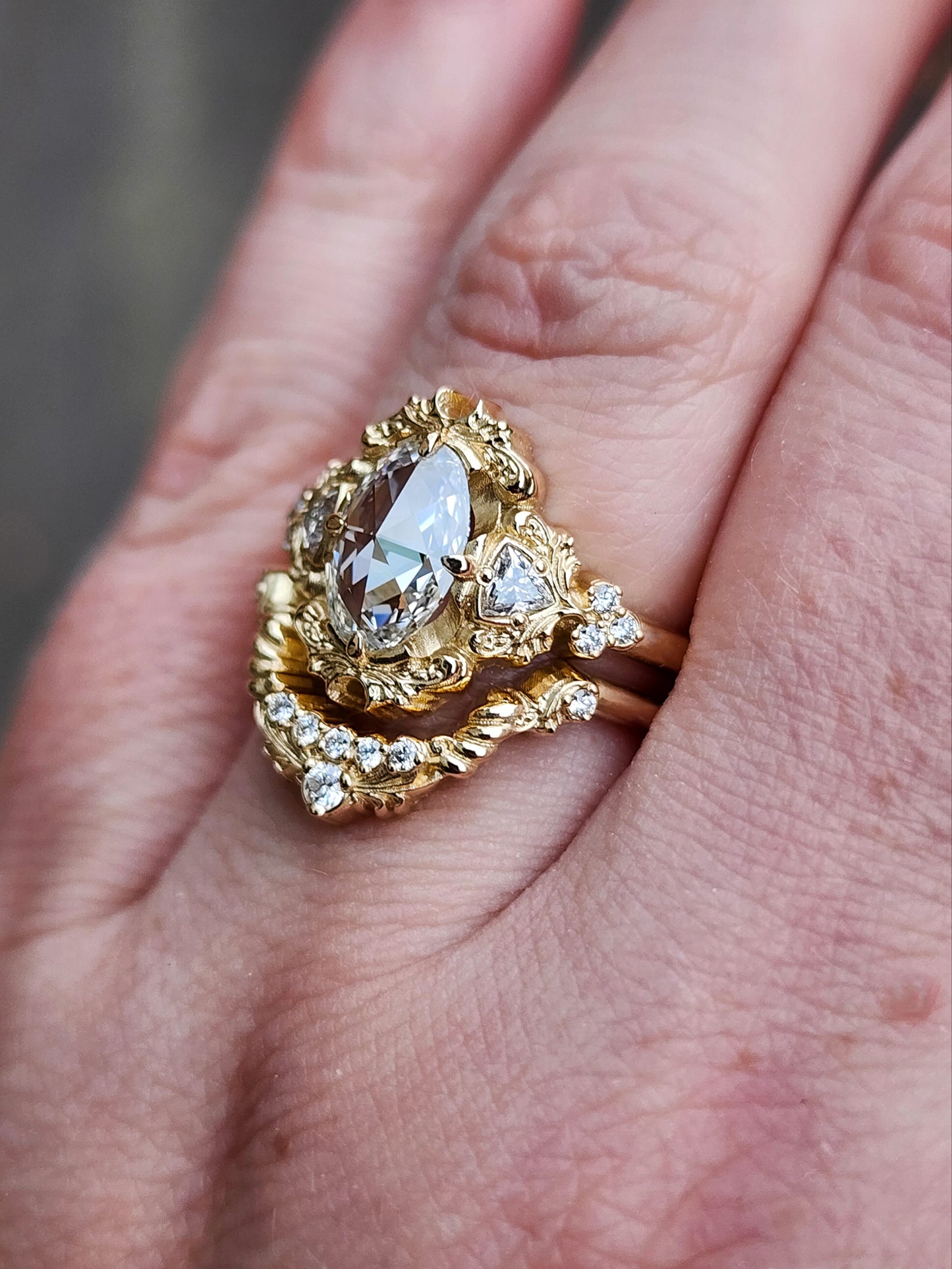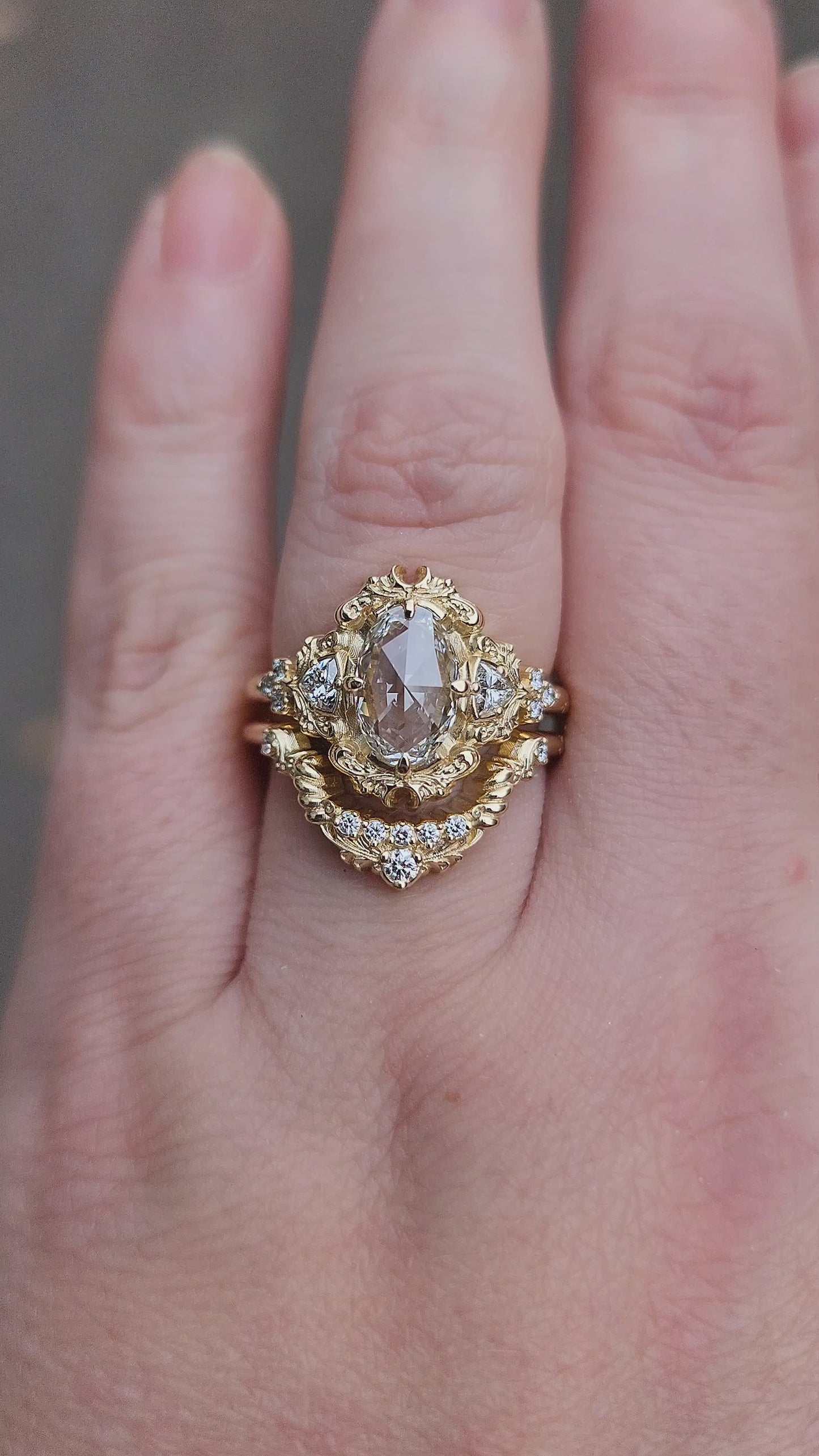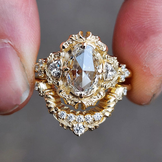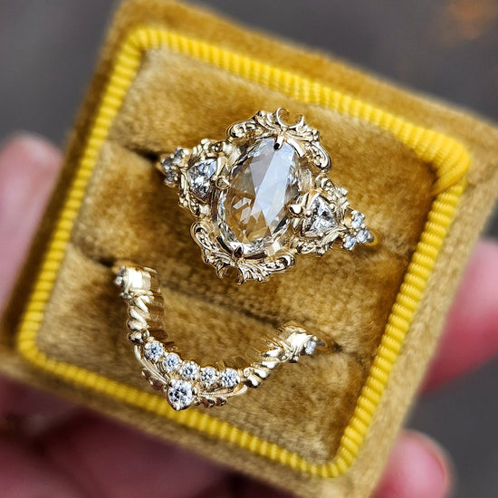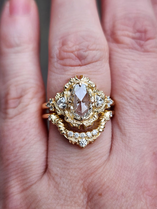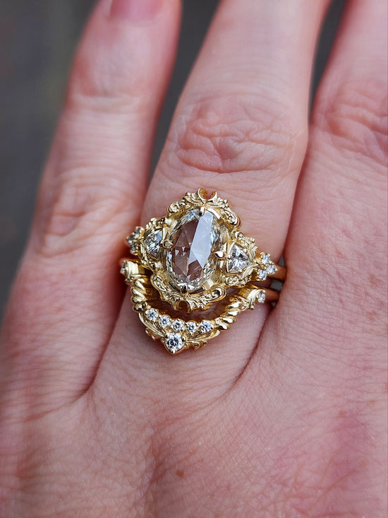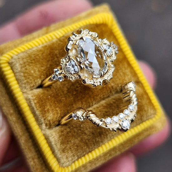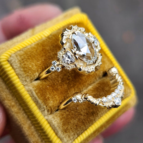 The Ophelia ring has your choice of center stone set in the center of a pair of sparkling trillions, approx weight of .18cts. On each side of the ring is a trio of gemstone accents. The wedding band is our diamond swing ring set with natural VS white diamonds.