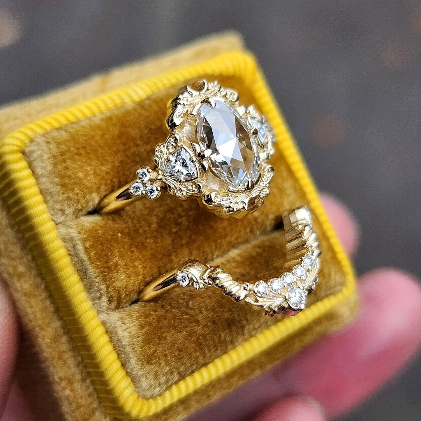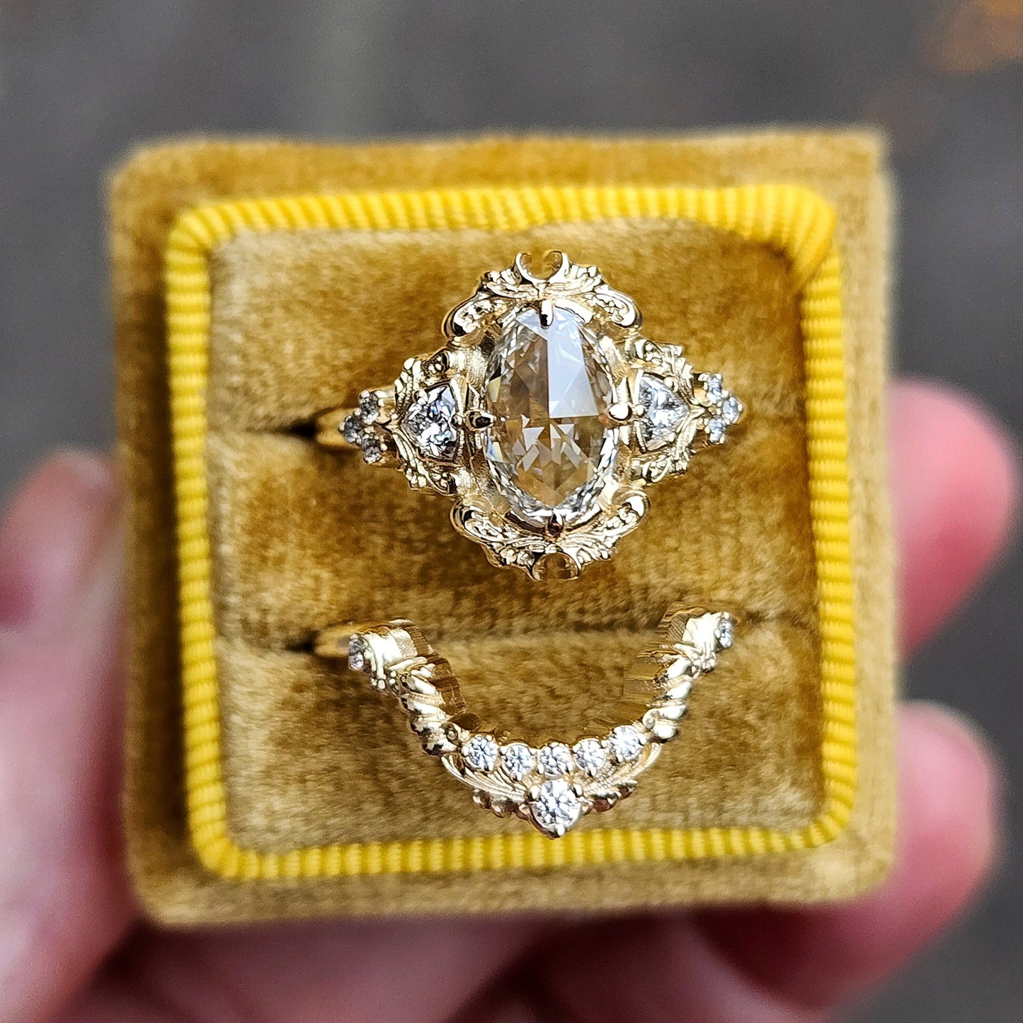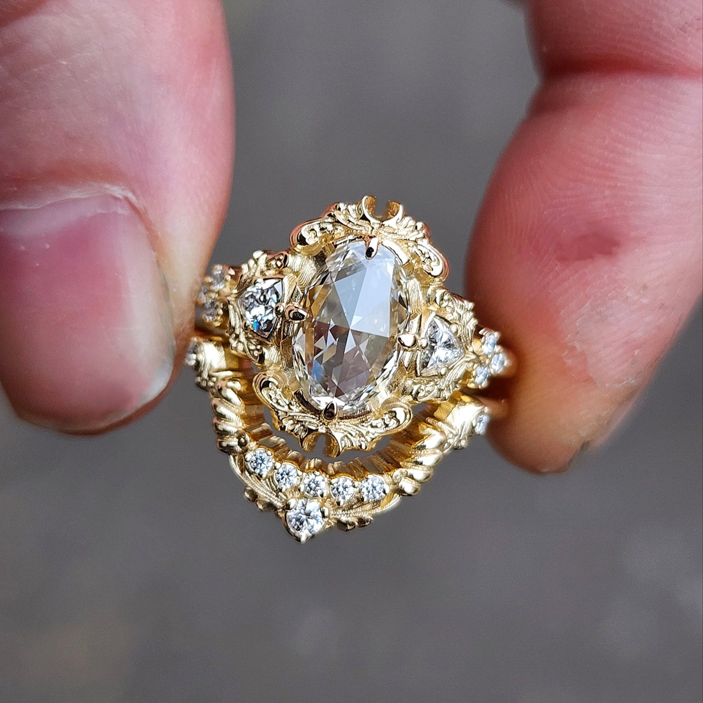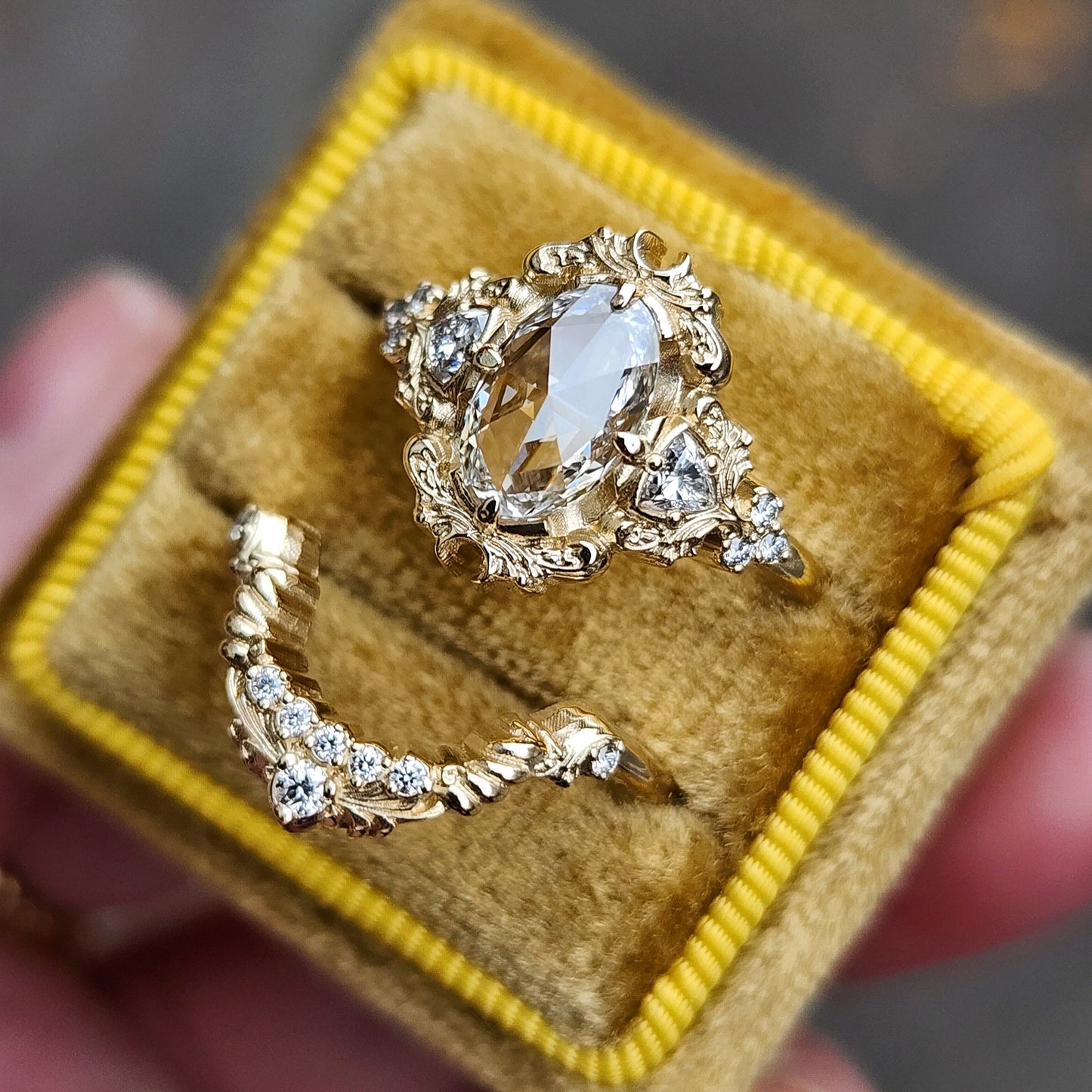 The Ophelia ring has your choice of center stone set in the center of a pair of sparkling trillions, approx weight of .18cts. On each side of the ring is a trio of gemstone accents. The wedding band is our diamond swing ring set with natural VS white diamonds.