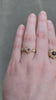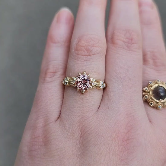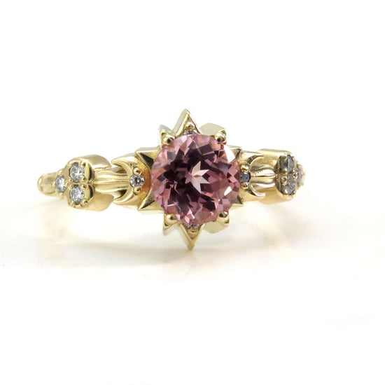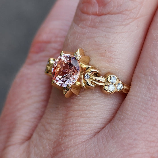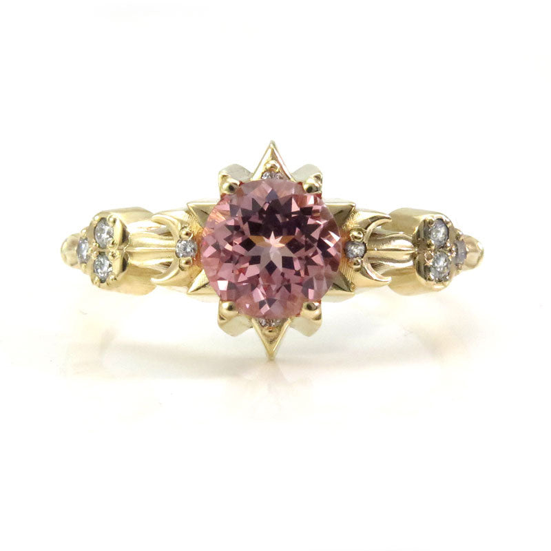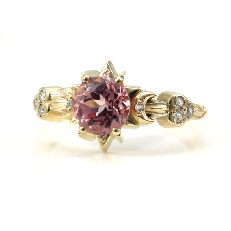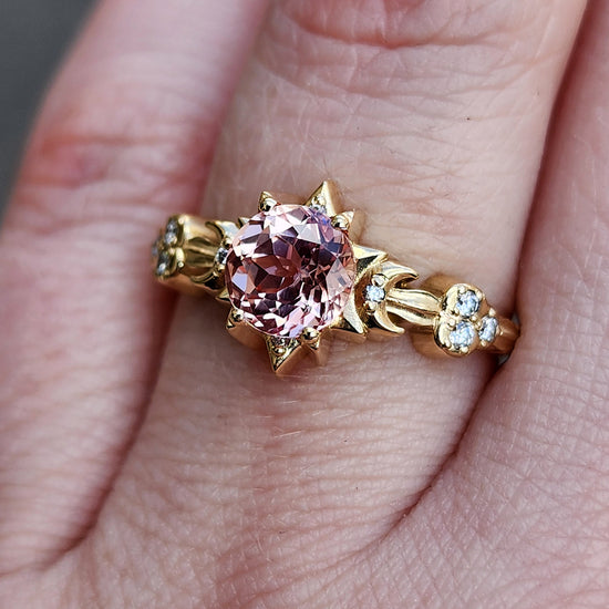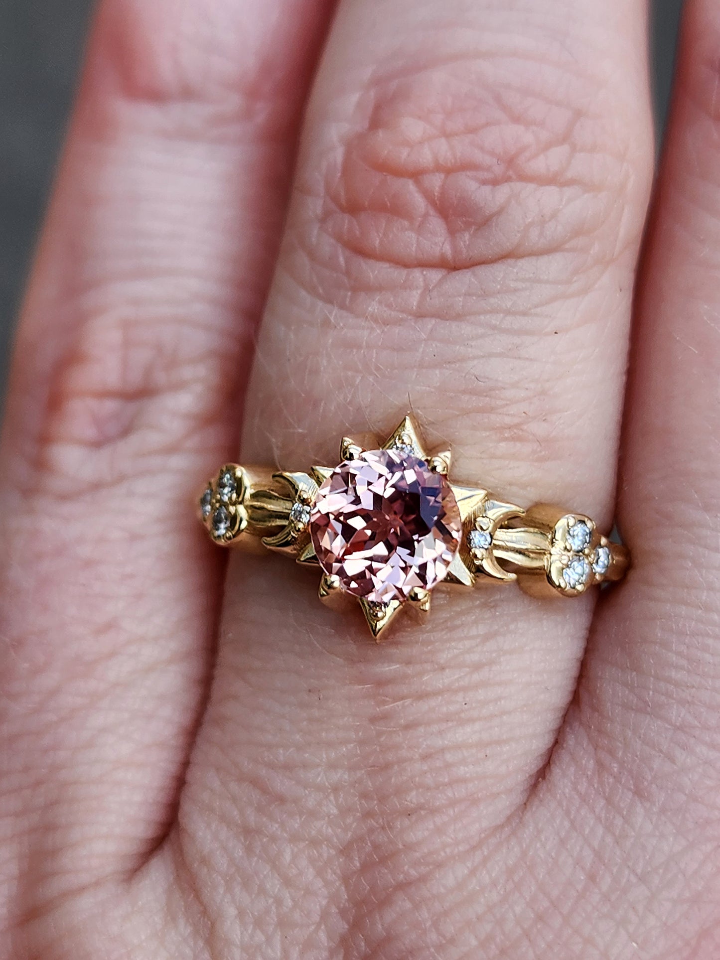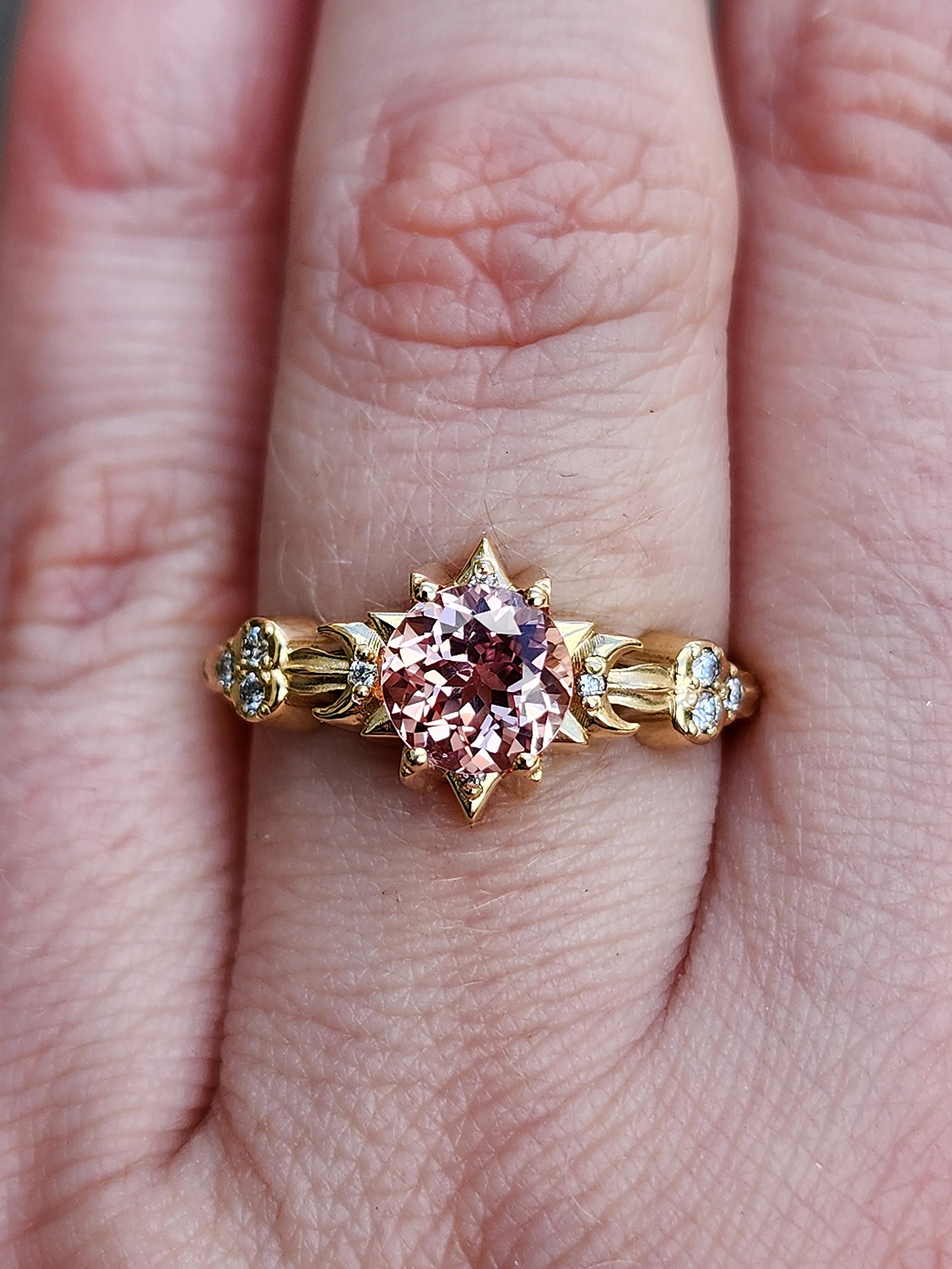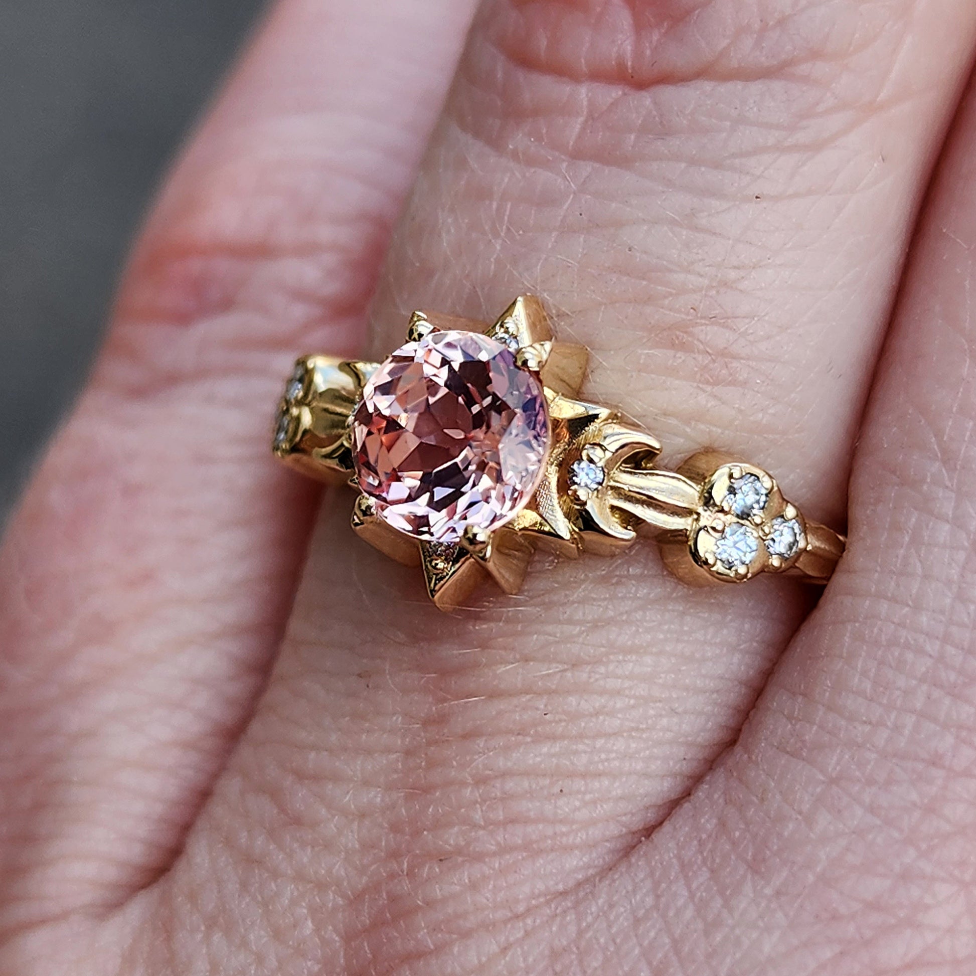 This engagement ring is nod to the moon and stars. The center stone shown in the main photo is a 6.5mm Chatham Peachy Pink Champagne Sapphire, it weighs approximately 1.40 carats. The side stones shown in the listing photos are VS clarity G-H color white diamonds, they have a combined weight of approx. .10 carats. Your ring can be set with black diamonds in place of the white diamonds upon request.